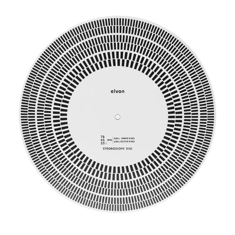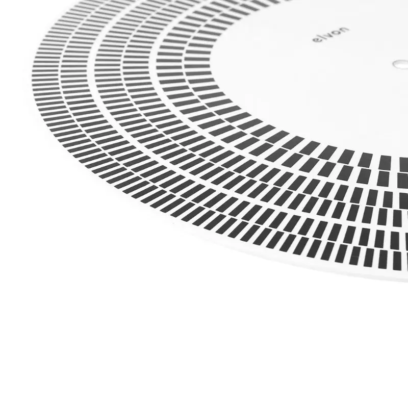 This vinyl record turntable tachometer calibration disc is an essential tool for vinyl enthusiasts seeking to ensure optimal performance from their turntables. With a diameter of 29.7 cm (11.69″) and a weight of nearly 180g, it features a double-sided design dedicated to speed measurement on one side and cartridge calibration on the other. The white base is adorned with clear black printed patterns, including zigzag lines and concentric rings that aid in calibration. Designed for use under artificial lighting, this disc effectively supports speed detection for 33, 45, and 78 RPM, along with 50Hz and 60Hz adjustments, ensuring a perfect sound experience.