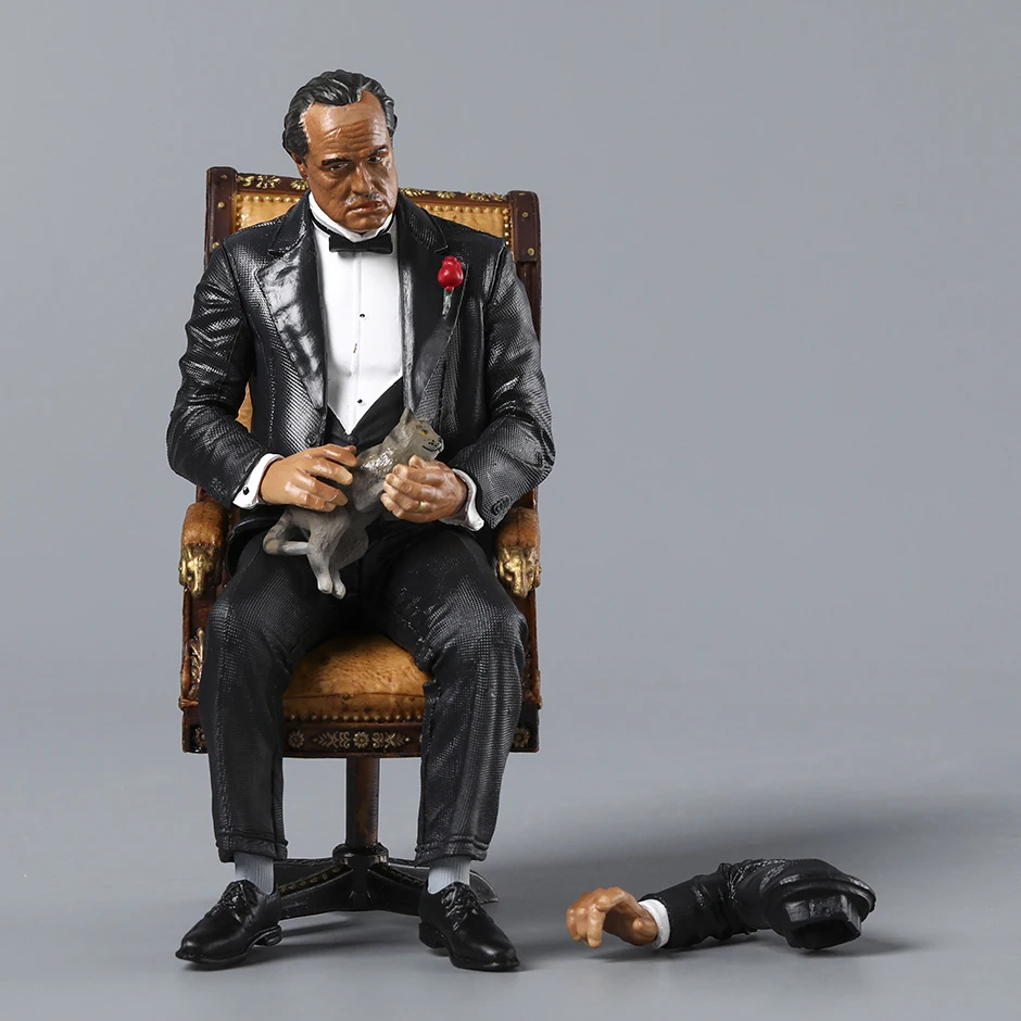 Bring home the iconic character of Vito Corleone with this highly detailed figurine, capturing the essence of the legendary mafia boss. Standing approximately 15 centimeters tall, this collectible showcases Vito dressed in a classic black tuxedo, complete with a white shirt, black bowtie, and a striking red flower lapel accent. Seated elegantly in an ornate vintage armchair upholstered in soft light brown fabric with intricate nailhead trim, he exudes authority and calm confidence. The figurine’s textured black suit, slicked-back dark hair, and serious expression make it a true masterpiece for display. Made from high-quality PVC, it’s perfect for movie enthusiasts and collectors seeking a regal, timeless piece to add to their collection or showcase at home or the office.