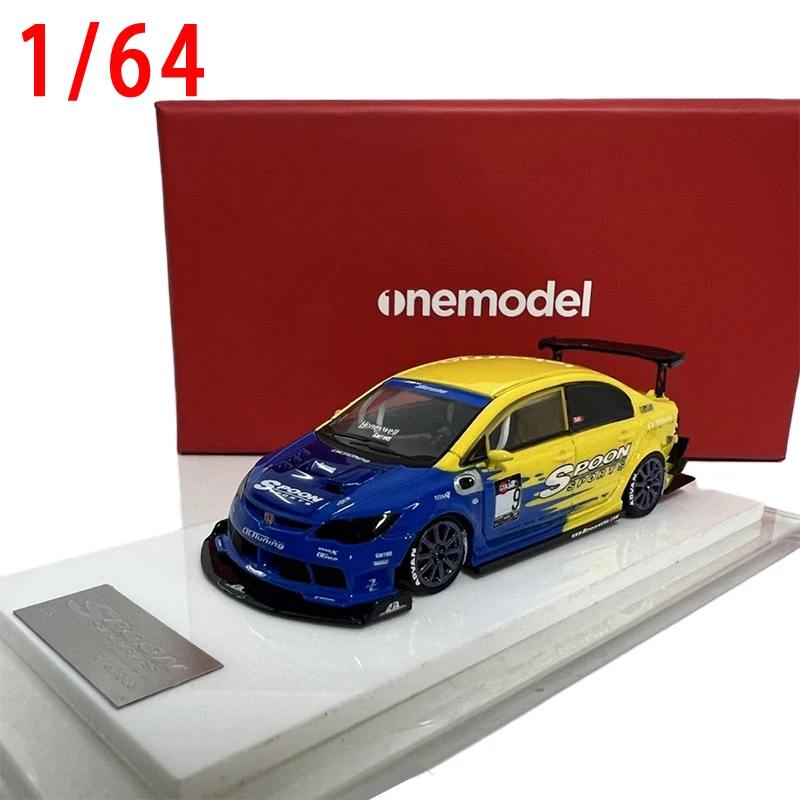 Step into the world of racing with this meticulously crafted diecast model of the Honda Spoon Type R No. 9. Measuring at a realistic 1/64 scale, this resin car displays an eye-catching two-tone paint job, with bright yellow on the roof, hood, and sides merging seamlessly into vivid blue on the front, rear, and lower sections. Its aerodynamic body features a prominent front splitter, vented hood, and a large black rear spoiler, capturing the essence of race-ready design. The model’s realistic black wheels, detailed rims, and racing-tread tires enhance its sporty appearance. Decorated with decals, sponsor logos, and the distinctive number 9, this collectible combines high detail with aesthetic appeal, making it perfect for display and admiration.