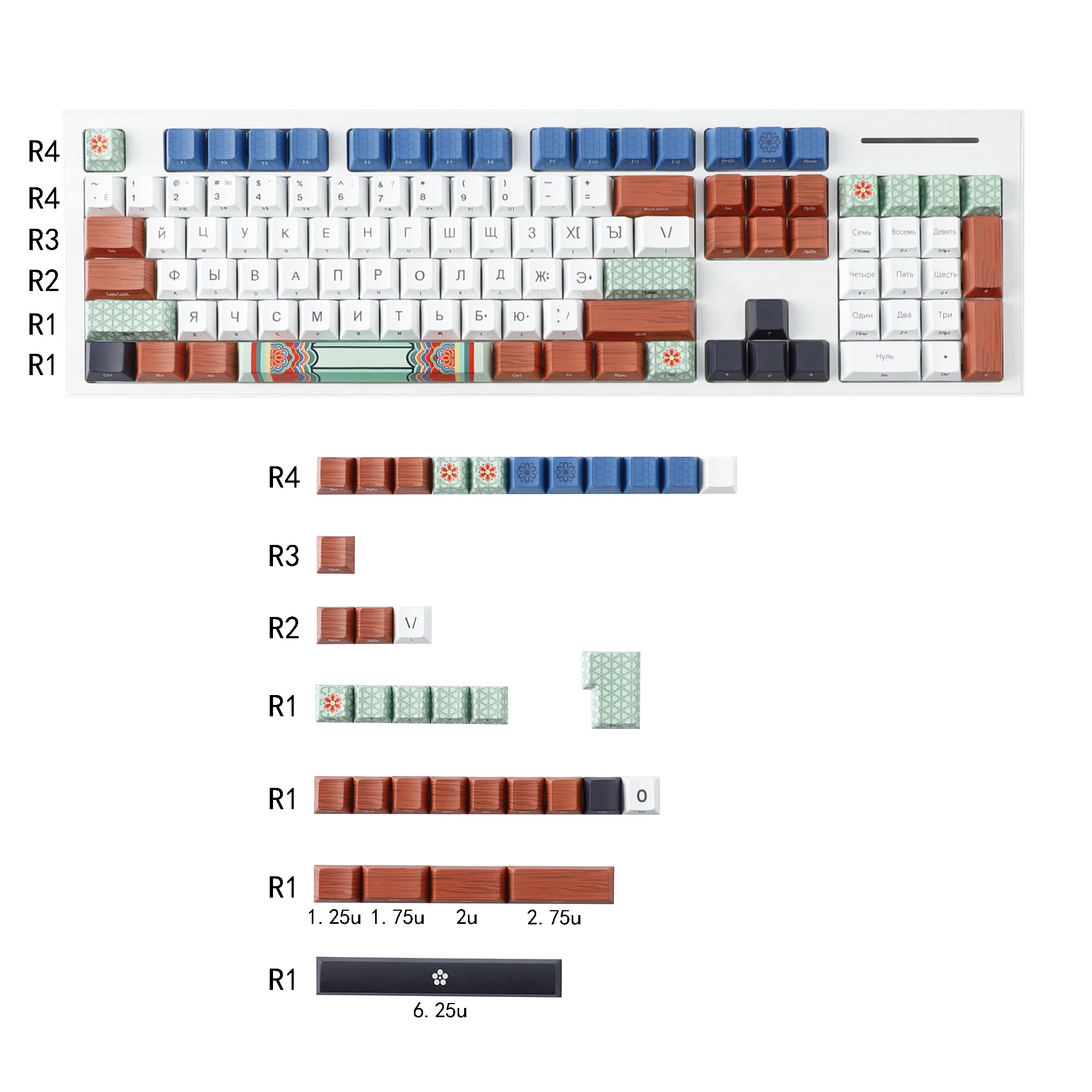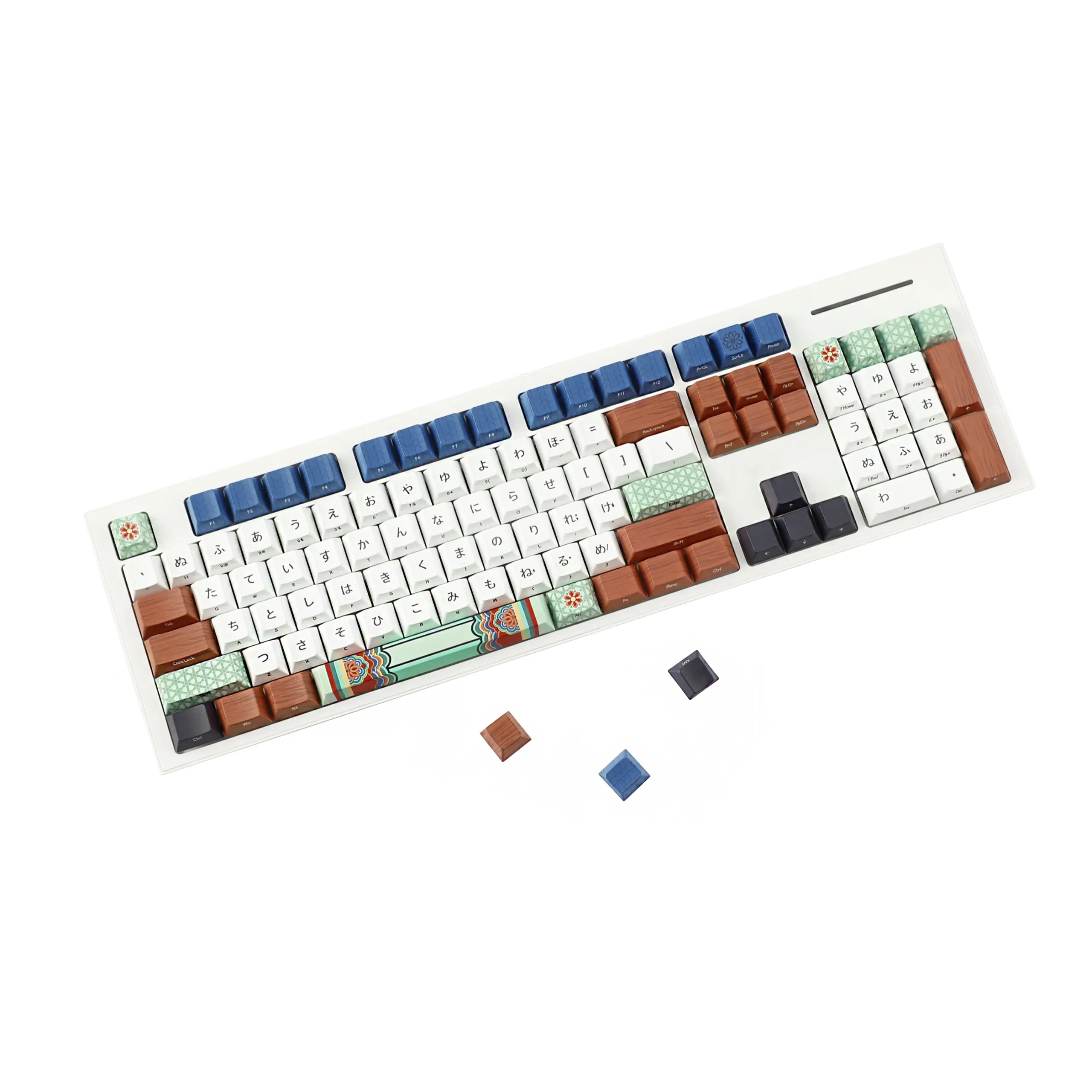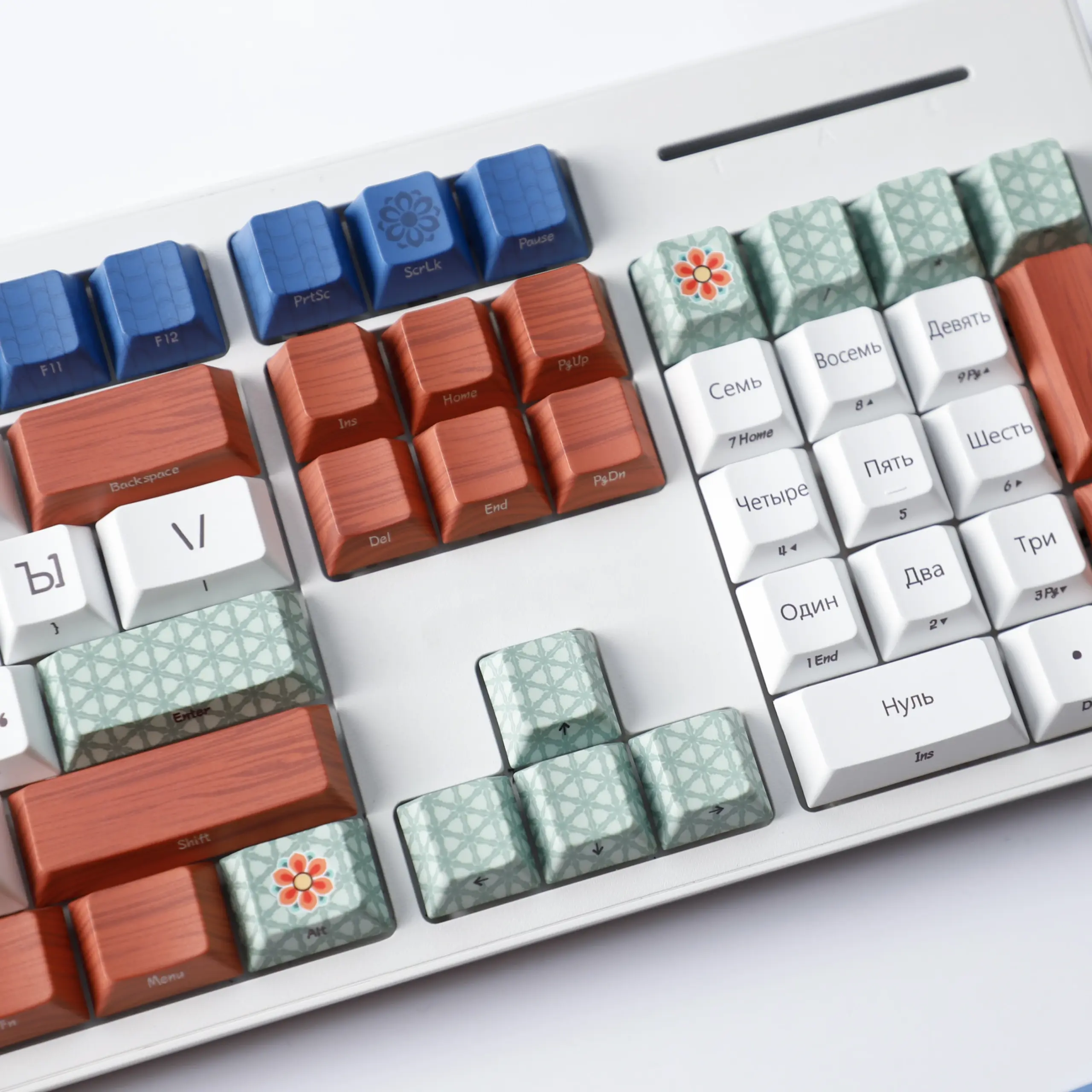 - Includes 139 uniquely decorated keys, such as bright blue ASCII art, reddish-brown wood grain keys, green floral motifs, and a multicolored floral/wave patterned spacebar.