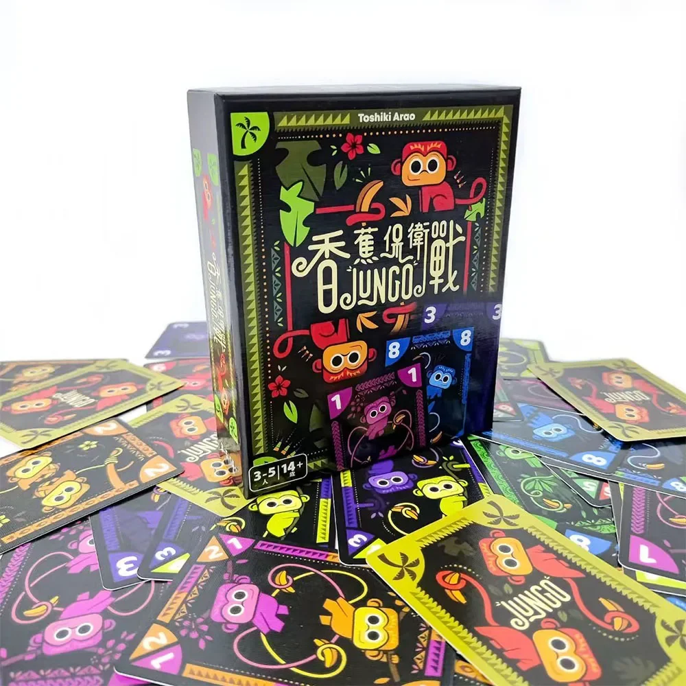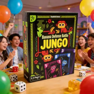 Experience endless fun with this colorful Banana Defense Battle JUNGO Board Game, specially designed for 3-5 players. This lively game combines humor and strategy, featuring a playful monkey mascot and vivid banana-themed illustrations that create an engaging atmosphere. The vibrant yellow, green, purple, and red colors pop against the sleek black background, drawing players into a world of animals and nature. Its modern cartoon-inspired design makes it perfect for casual gatherings, whether you’re enjoying a friendly competition with friends or a lively family night. This game promises hours of entertainment and laughter, making every moment memorable while enhancing your social bonds as you strategize and interact together.