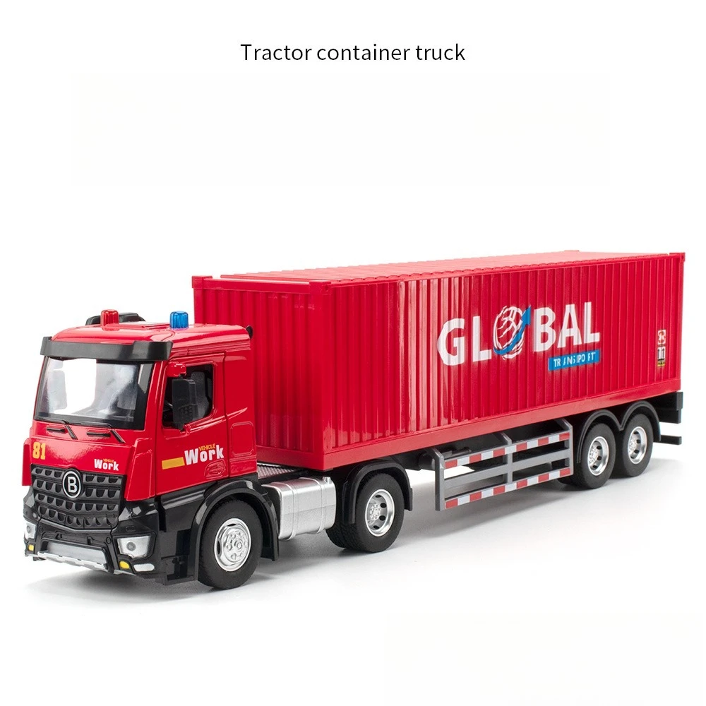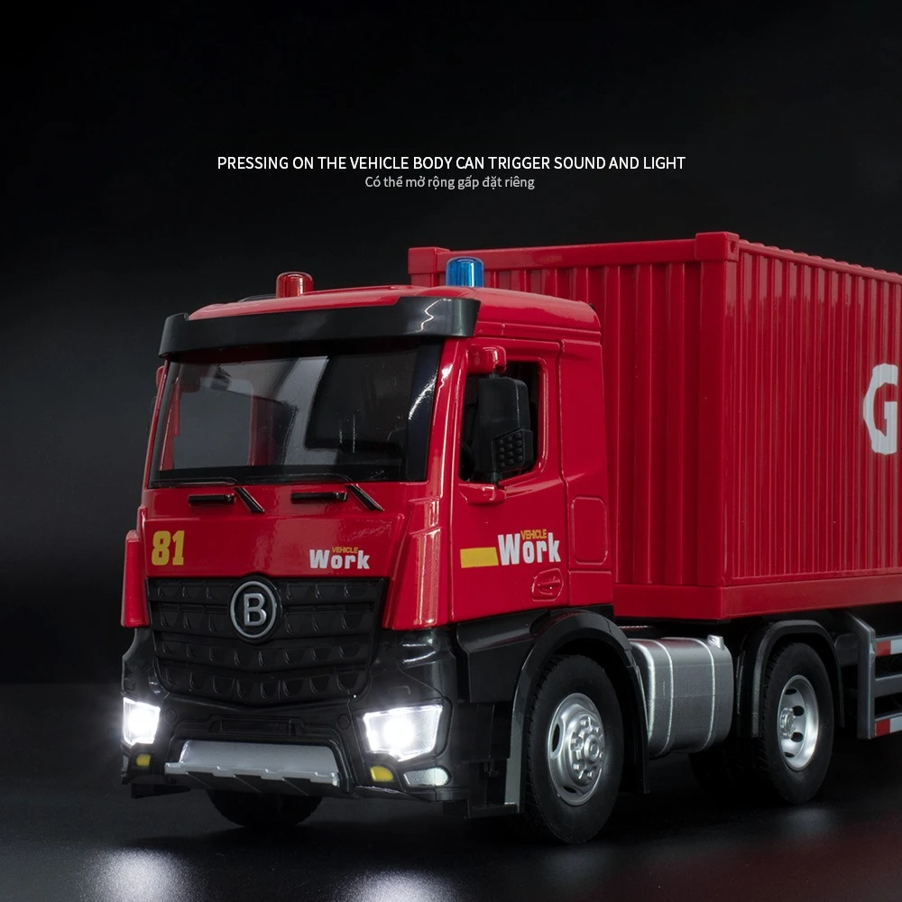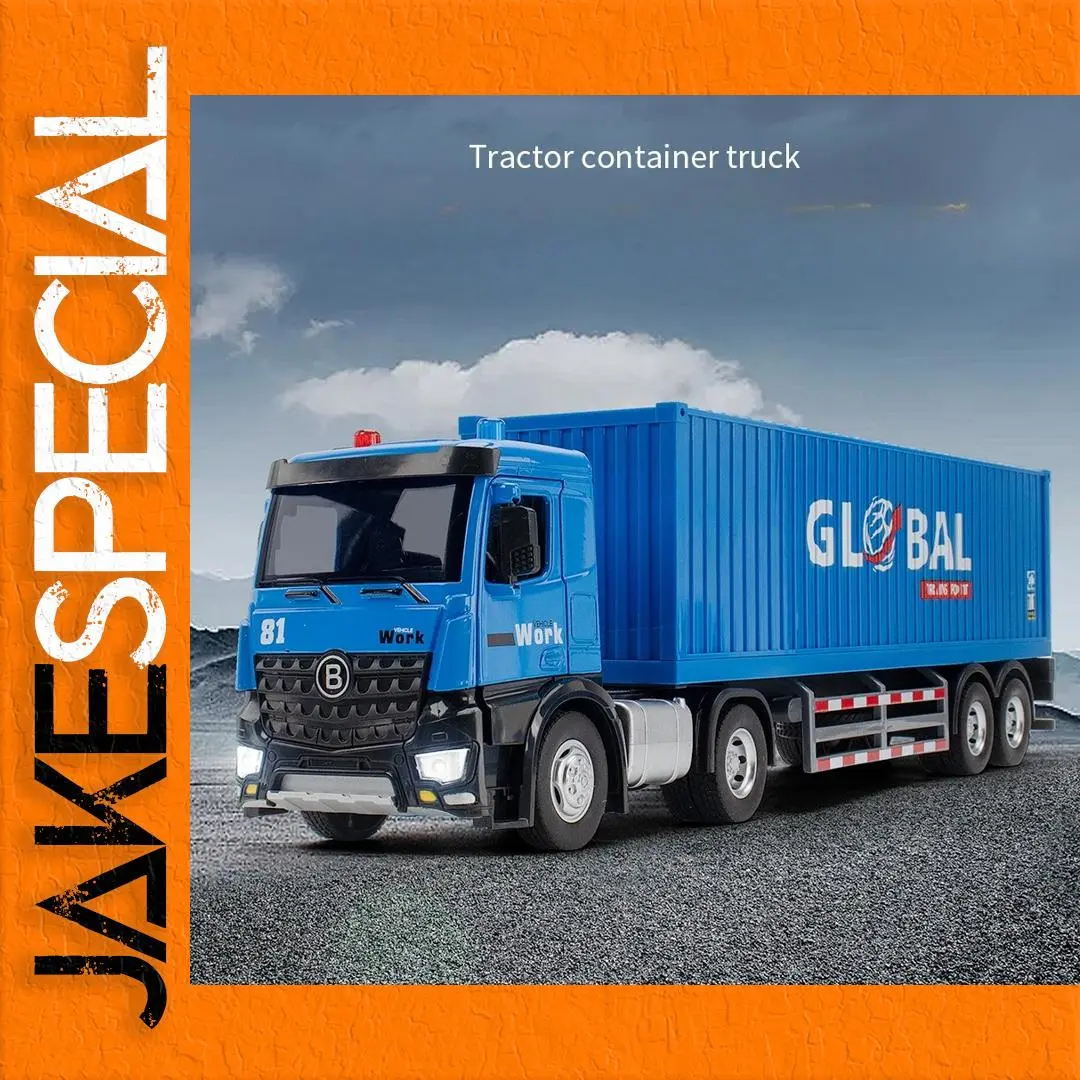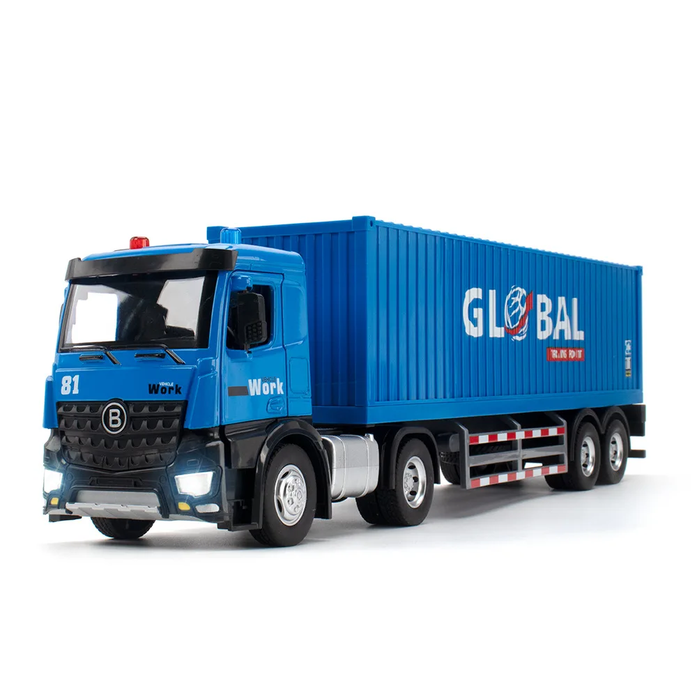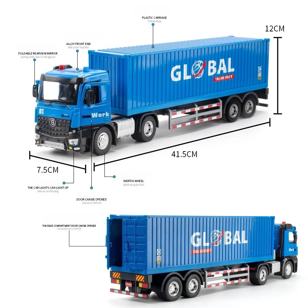 Imagine adding a striking, highly detailed model to your collection that instantly captures attention and elevates your display. This this 1:24 scale diecast transport truck features a sleek modern design with a vibrant blue finish, sharp, angular lines, and a realistic industrial aesthetic. Its textured shipping container with vertical ridges displays the bold GLOBAL logo and stylized globe, offering an authentic look. The model's robust metal construction provides weight and durability, complemented by detailed decals, movable parts, and a detachable container. Equipped with sound and light modules powered by three batteries (not included), this model delivers immersive interactivity. Perfect for collectors who appreciate craftsmanship combined with contemporary style, this transport truck combines visual appeal with functional excellence, making it an impressive centerpiece.