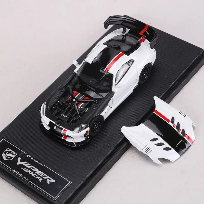Experience the thrill of the high-performance Dodge Viper ACR with this exquisite 1:64 scale die-cast alloy model. Painted in a vivid, glossy blue with black racing stripes, this model captures the sleek, aerodynamic design of the real car, including prominent spoilers and a high-mounted rear wing for an aggressive appearance. The open cover feature reveals a detailed miniature engine bay, showcasing carefully painted components that mimic the real engine's complexity. Its textured tires and black rims add a realistic touch, making it an impressive display piece for collectors. Crafted with meticulous attention to detail, each model reflects the handcrafted process, with slight variations that enhance its unique charm. This model is perfect for enthusiasts who appreciate precision craftsmanship and stylish automotive design.