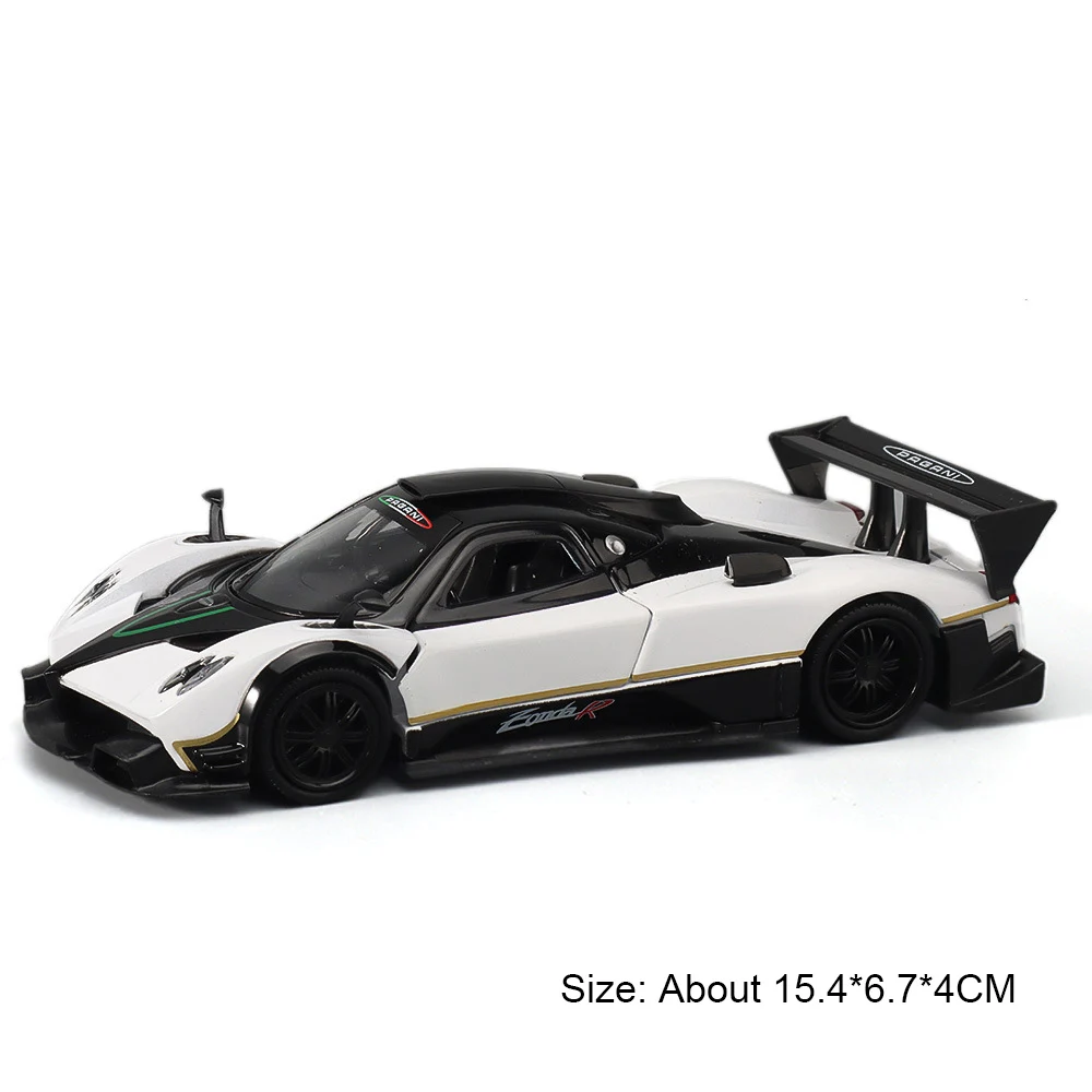 This 1:32 scale alloy diecast car model features a durable metal body with a plastic chassis and rubber tires, measuring approximately 15.4 x 6.7 x 4 cm for the Zonda and 14 x 6 x 3.6 cm for the Huaya. Designed for display or collection, it boasts opening doors, built-in sound and light effects, and a pull-back mechanism for added realism and play value. Crafted through diecast processing, the model combines intricate detail with durability, suitable for collectors and enthusiasts aged 14 and above. Available in vibrant colors including white, orange, blue, and red for the Zonda, and green, silver, and white for the Huaya, this high-simulation miniature captures the sleek, dynamic aesthetics of the original racing-inspired vehicles.