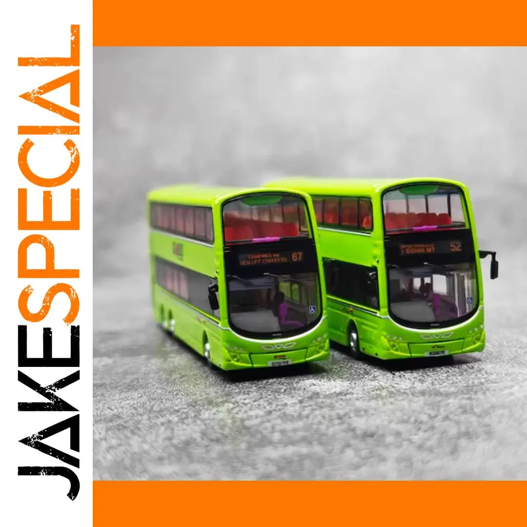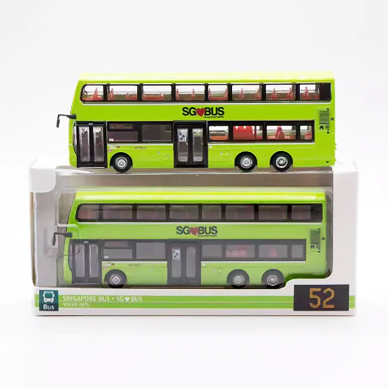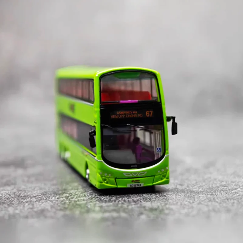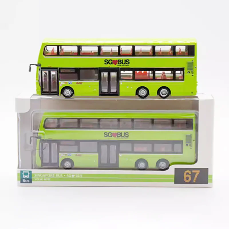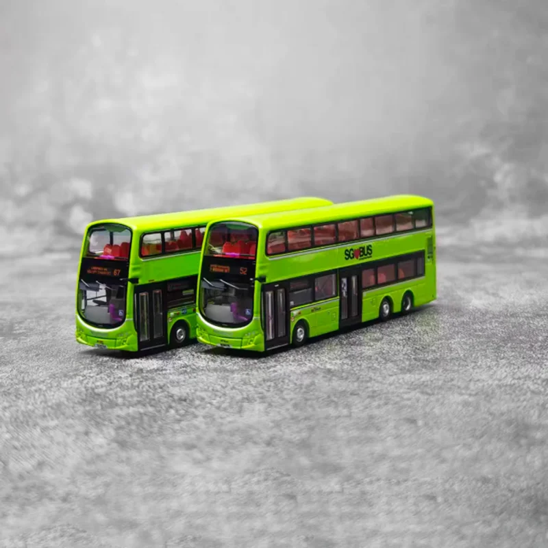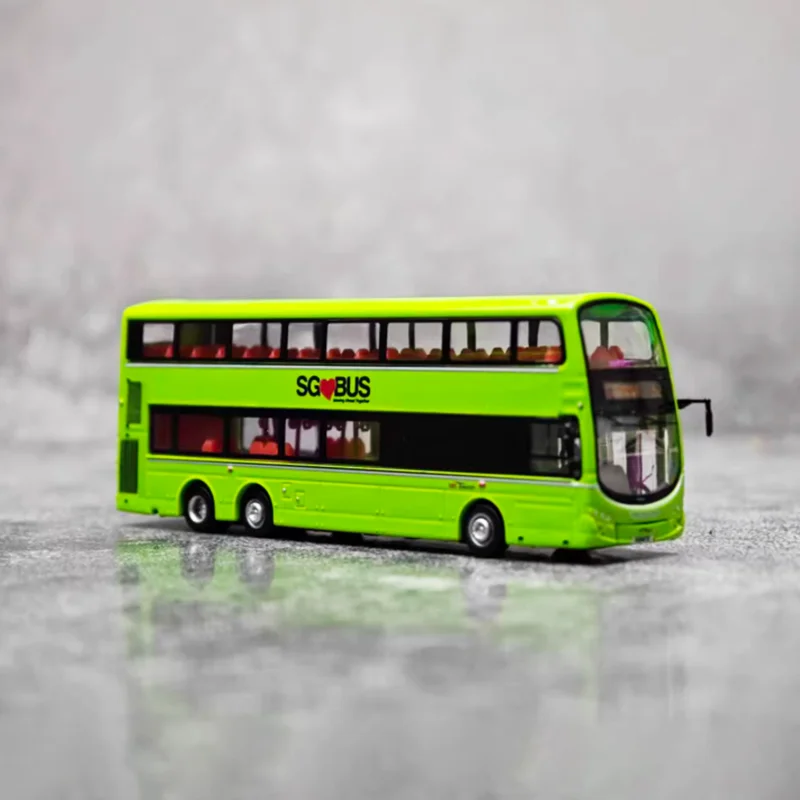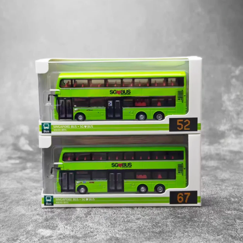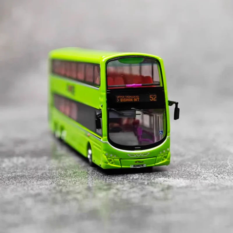 Experience the realism of urban transportation with this 1:110 scale alloy diecast model of a B9TL double-decker bus, available in vibrant color options including code 52 and 67. Crafted from durable alloy, this high-quality static display captures the sleek, modern design with smooth, curved edges and a glossy finish that highlights intricate details. The model features panoramic front windshields framed in black, tinted side windows, and realistic black side mirrors, with bright red interior seating visible through the windows. Measuring true to scale, this collectible is designed exclusively for adult enthusiasts and collectors seeking to enhance their display collection.