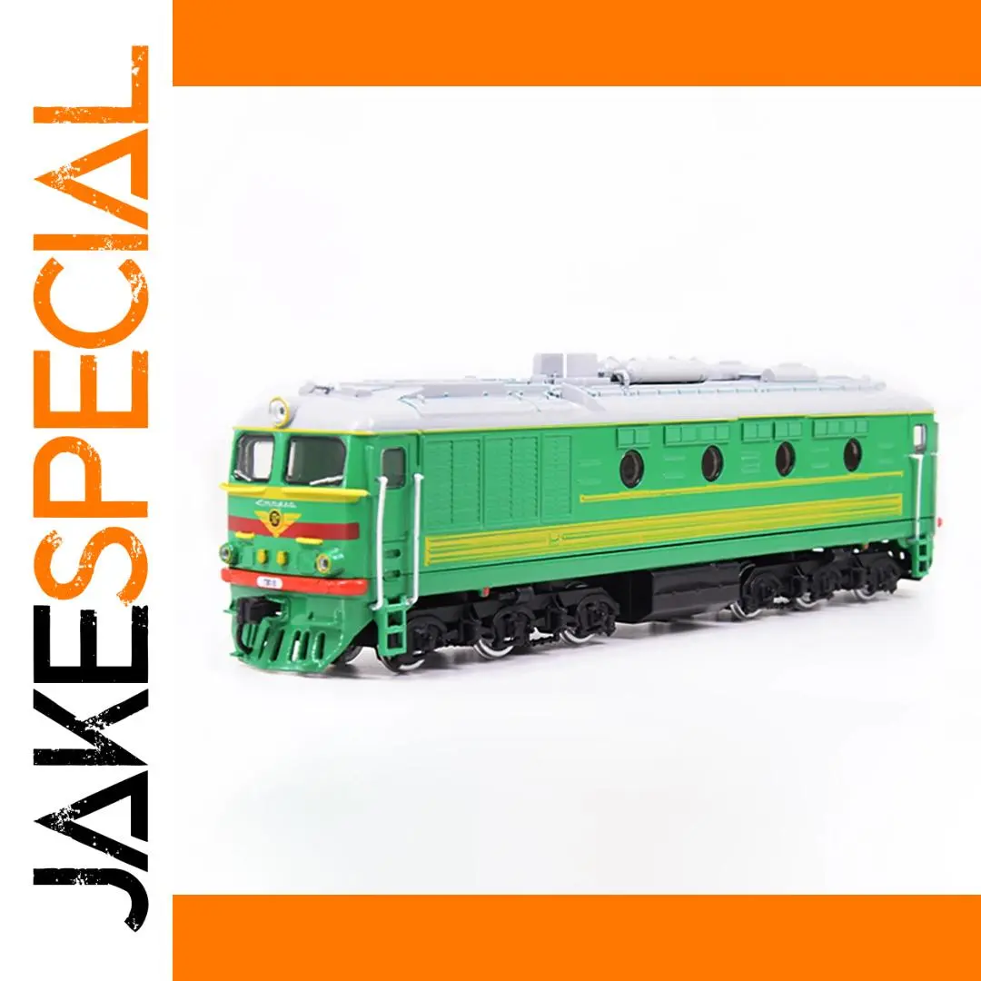 Experience the striking realism of this detailed 1:87 scale Soviet diesel passenger locomotive, expertly crafted for collectors and enthusiasts. Made from durable plastic and rubber, this fully enclosed static model boasts a vivid green finish accented by bold yellow stripes along its sides, creating a eye-catching display piece. The rounded nose, prominent headlamp, and small circular windows add authentic aesthetic details, while the raised top elements, including a white ventilation structure and tiny fixtures, enhance its realistic appeal. The dark-toned front grille and detailed black undercarriage with wheels and suspension lend a robust, industrial feel. This model is perfect for display, gifts, or as a hobby collector's item. Please note minor paint flaws may be present, adding to its authentic charm.