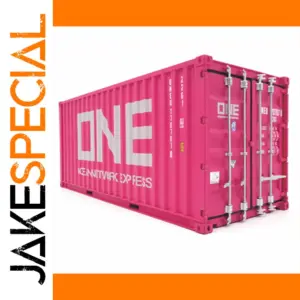 - The detailed design includes a bright pink exterior with bold white branding, gray markings, and metal locking bars, reflecting an industrial shipping aesthetic.