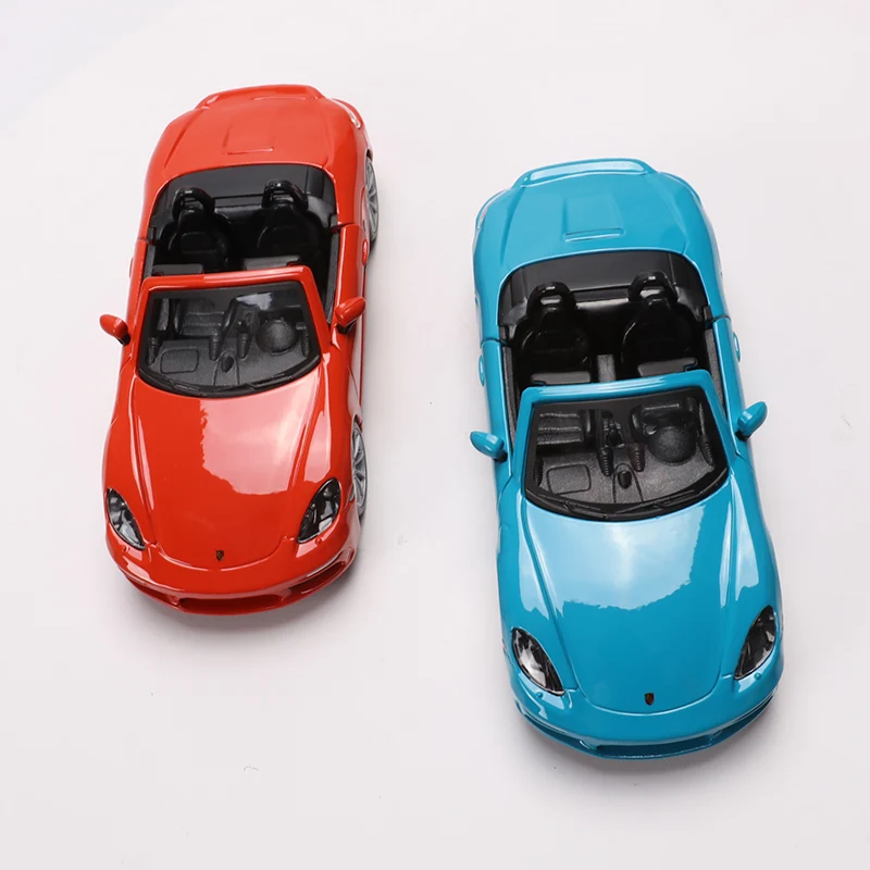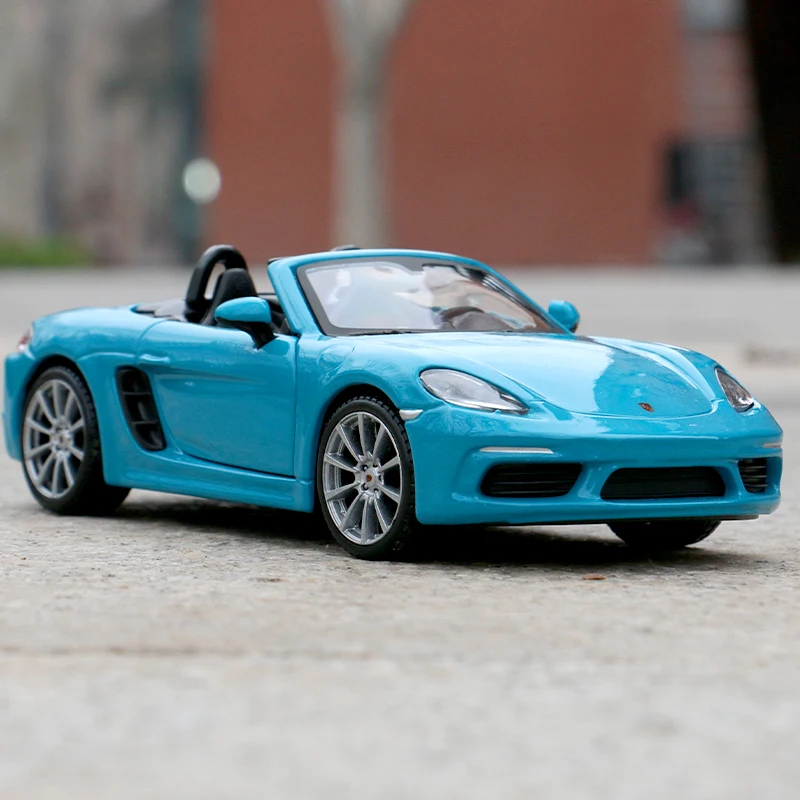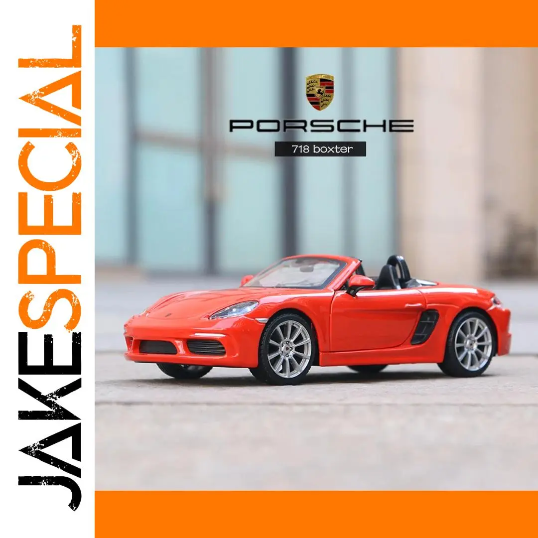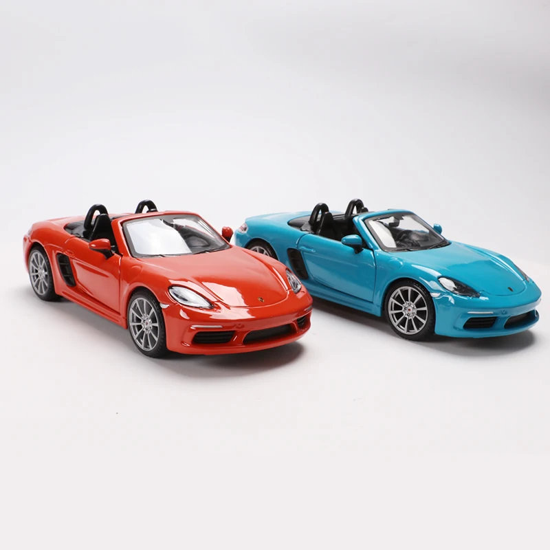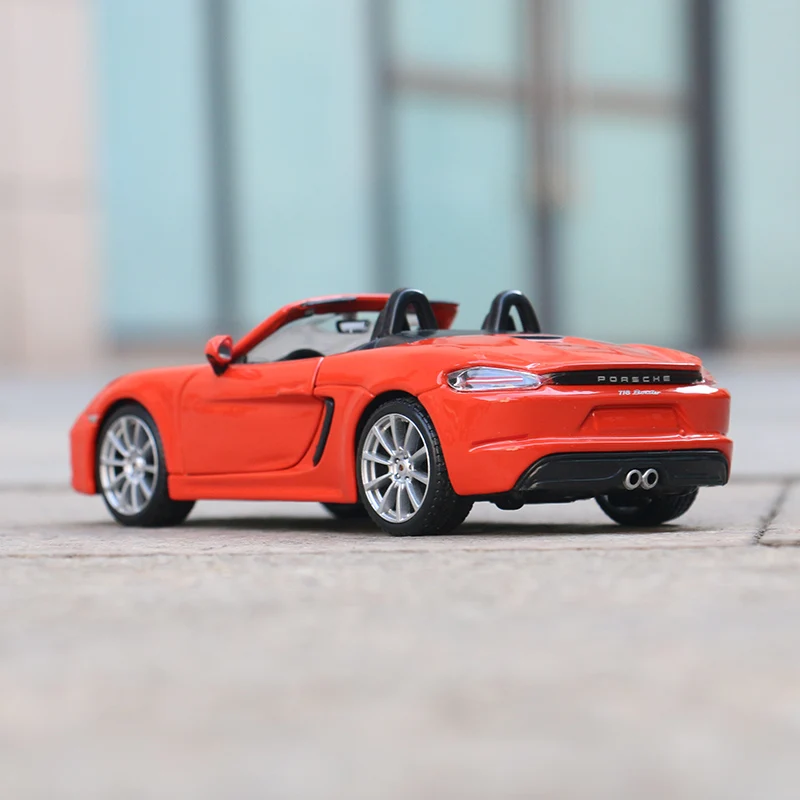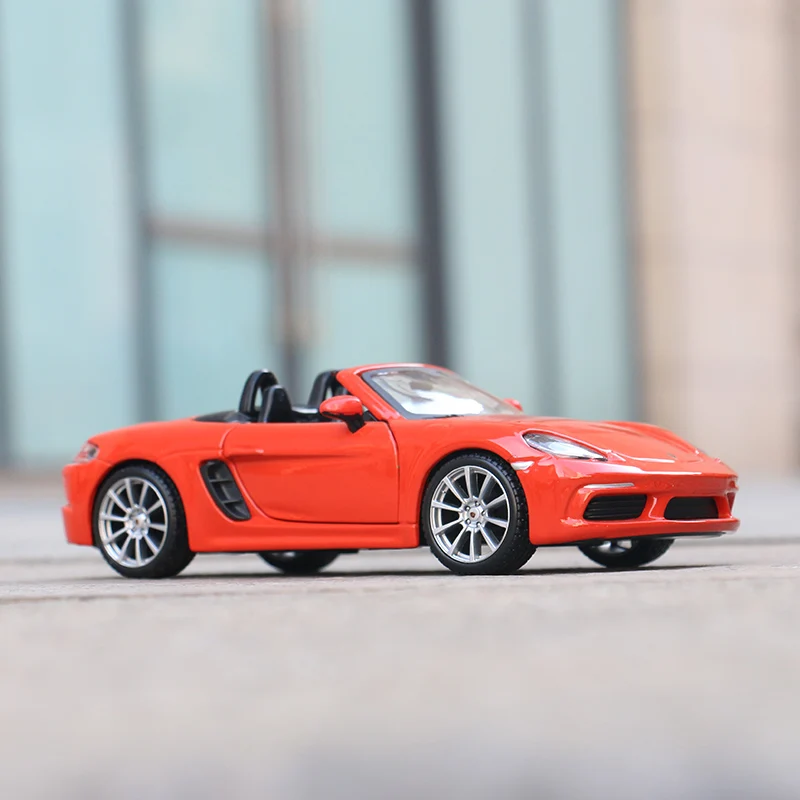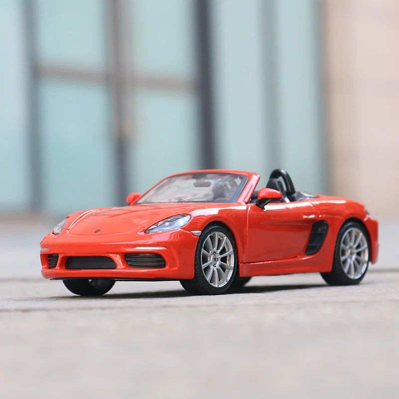 Experience the sleek, sporty design of the Porsche 718 Boxster with this detailed 1:24 scale diecast model by Burago. Crafted from high-quality alloy, the model showcases a vivid red glossy finish that highlights its aerodynamic curves, sculpted hood, and realistic headlights with clear lens effects. The side profile features black air intakes behind door handles and intricately detailed multi-spoke silver alloy wheels with low-profile tires. The rear displays a sculpted bumper, tail lights, and exhaust pipe, capturing the essence of this iconic vehicle. Perfect for adult collectors, this non-electric, metal model is a refined addition to any automotive collection.