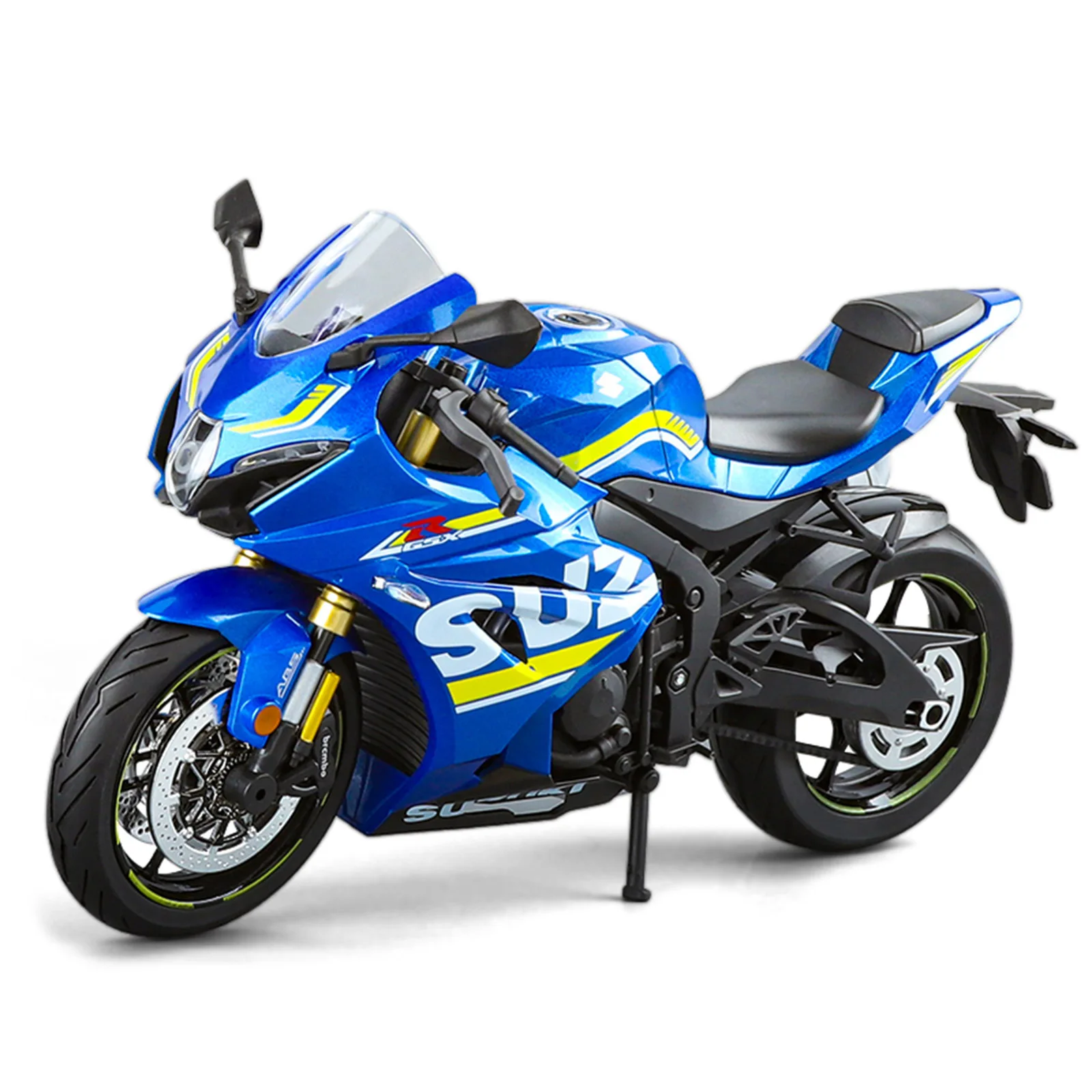 Imagine adding a striking piece to your collection or workspace that captures the essence of a high-performance sport bike. This detailed miniature replica of the Suzuki GSX-1000R features a vivid bright blue finish, accentuated with bold yellow and white highlights. Its textured fairings and contours mimic the sleek aerodynamics of the original, making it a true collector’s piece. The front showcases a clear, curved windscreen above a narrow, sculpted headlight, enhancing its aggressive style. Black handlebars, side mirrors, and handgrips add realism, while the wheels display intricate spoke patterns with textured tires and sidewall markings. The gold suspension forks and detailed brake discs bring stunning accents to this meticulously crafted model. It’s perfect for enthusiasts and collectors seeking a visually authentic motorcycle replica.