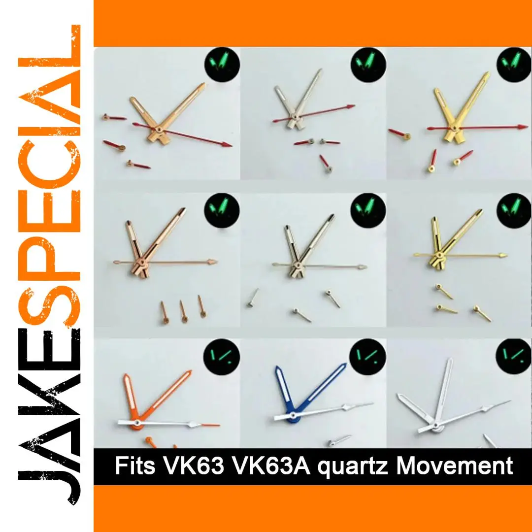 Experience the perfect blend of style and functionality with this set of watch hands designed for VK63 and VK63A quartz movements. Whether you prefer luxurious gold tones, sleek silvery finishes, vibrant luminous accents, or subtle pastel hues, this collection offers it all. Each set includes precisely crafted hour, minute, and second hands that ensure accurate timekeeping while enhancing your watch’s aesthetic appeal. The luminous options, such as bright orange, blue, and green, improve visibility in low-light conditions. With versatile colors and high-quality finishes, these hands are ideal for restoring or customizing your watch, making it look elegant and modern. Transform your timepiece into a striking accessory today.