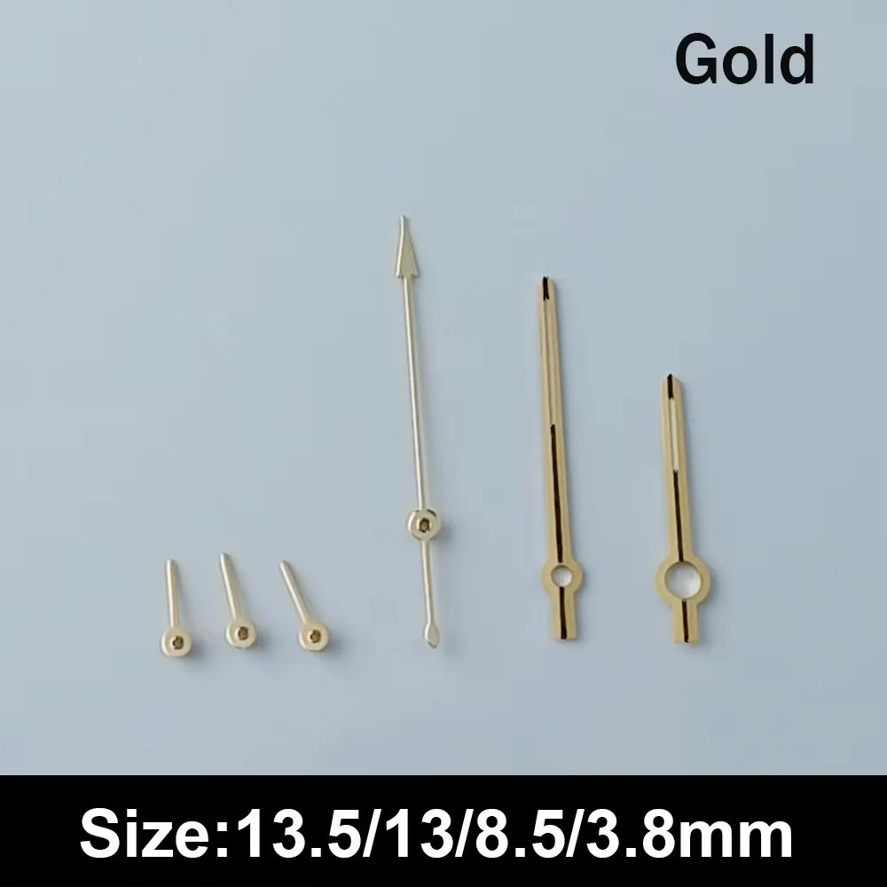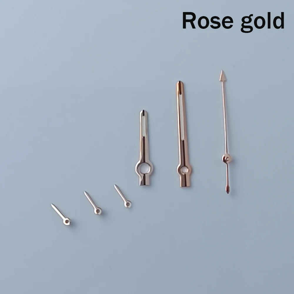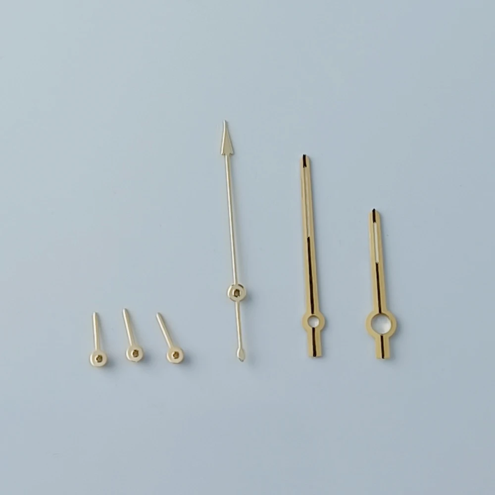 This set of watch hands is specifically designed for VK63 and VK64 quartz movement watches, featuring a polished metallic finish that ensures a sleek and modern look. The set includes five distinct hands arranged in increasing size, with the first three being shorter and tapering to pointed ends. Additionally, one hand is thicker with a circular cutout, while the longest hand is thin and pointed, ideal for seconds. Available colors include 3 gold, 9 white blue, 1 silvery, 8 white orange, 2 rose gold, 5 gold, 4 silvery, 7 white, 6 rose gold, 13 gold, 12 silvery, 11 higher rose gold, and 10 higher gold.