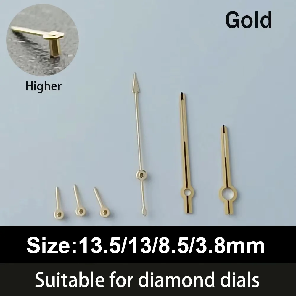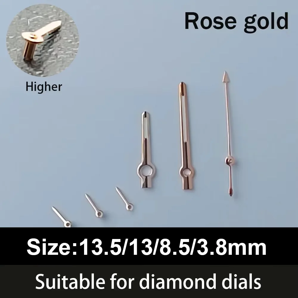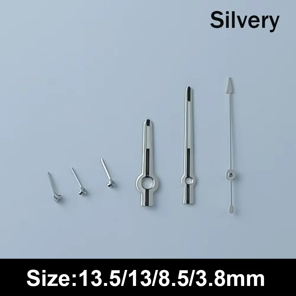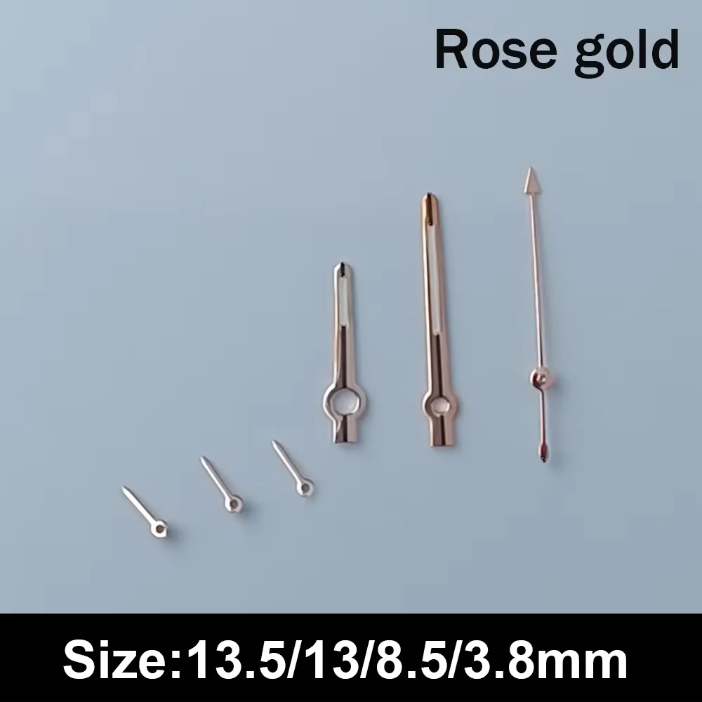 This set of watch hands is specifically designed for VK63 and VK64 quartz movement watches, featuring a polished metallic finish that ensures a sleek and modern look. The set includes five distinct hands arranged in increasing size, with the first three being shorter and tapering to pointed ends. Additionally, one hand is thicker with a circular cutout, while the longest hand is thin and pointed, ideal for seconds. Available colors include 3 gold, 9 white blue, 1 silvery, 8 white orange, 2 rose gold, 5 gold, 4 silvery, 7 white, 6 rose gold, 13 gold, 12 silvery, 11 higher rose gold, and 10 higher gold.