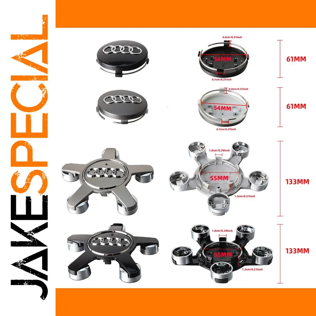 Enhance your Volkswagen’s aesthetic with this set of four hub caps crafted from durable 100% ABS material featuring a high-gloss finish in black, grey, or silver. These impact-resistant, weatherproof caps measure approximately 61mm or 133mm in outer diameter, with inner diameters of 54mm or 55mm, and depths of about 0.8cm or 1cm. Showcasing the iconic four interconnected rings accented with chrome or metallic details, they add a refined and modern look to your wheels. Easy to install with two included star-shaped adapters, these caps are compatible with Volkswagen models including A1, A3, A4, A5, A6, Q2, Q3, Q5, Q7, and series such as B6, B8, B9, 8P, 8V, 8L, C5, C6, C7, TTRS, RS, and S-line, providing a stylish upgrade and reliable protection.