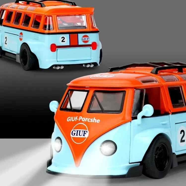 The detailed diecast model of the Volkswagen T1 Bus captures the nostalgia of the iconic vehicle with its vibrant red and white color scheme. This 1:32 scale model showcases a pointed nose and smooth rounded contours, complemented by large headlights with glass-like finishes and circular fog lights. The design features distinctive branding such as the Shell logo and “Sholl V-Powre.” With sound and light functionalities, it enhances interactive play. The detachable roof cover adds versatility to this model, making it not just a toy but a coveted collector’s item. Crafted from durable metal, this model is perfect for enthusiasts and kids aged 14 and above.