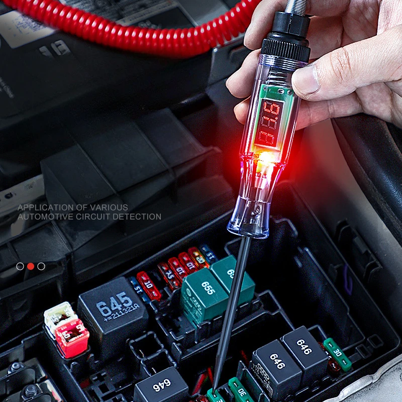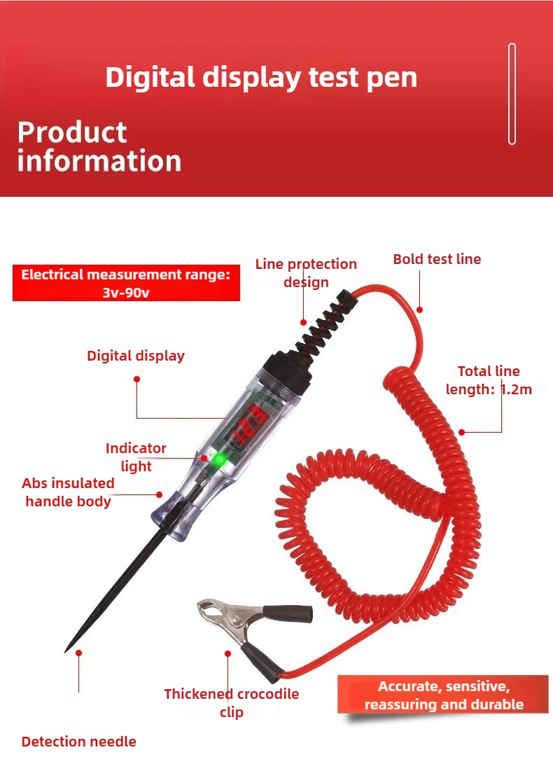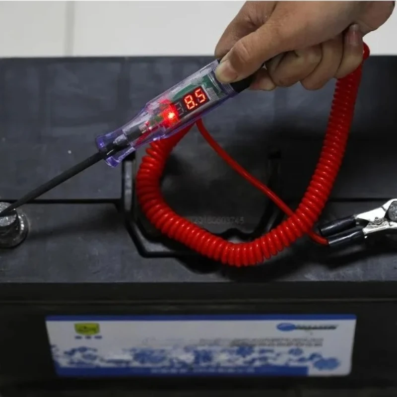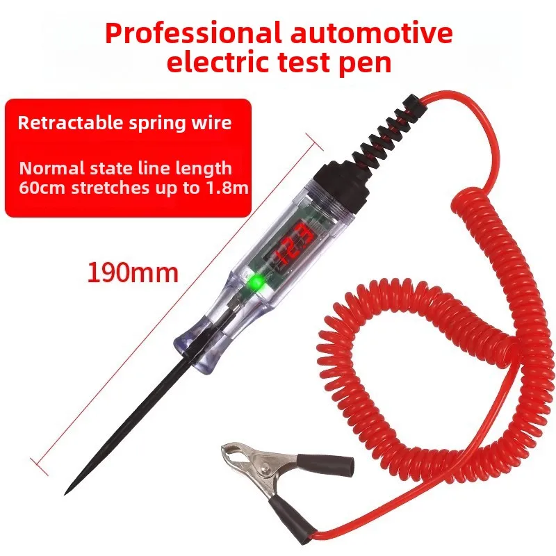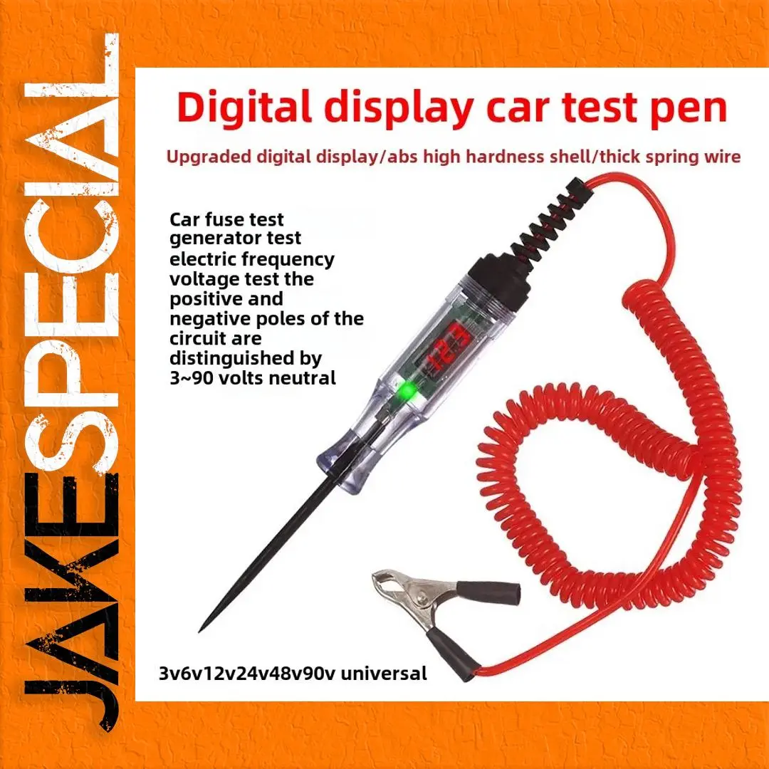 The Voltage Circuit Tester Pen is your essential tool for auto diagnostics and electrical repairs. With a transparent body that showcases an easy-to-read digital display showing measurements of “12.3,” this tester goes beyond basic functionality. Its slender, pointed probe allows for precise insertion into connectors and circuits, while a bright green LED indicator assures you when voltage is detected. The robust coiled wire in eye-catching red connects seamlessly to a secure black clamp for grounding, ensuring stability during measurements. Made from durable ABS plastic, it promises longevity. Designed for measuring voltages of 6V, 12V, 24V, and 70V, this tool will enhance your precision and confidence in every diagnostic task.