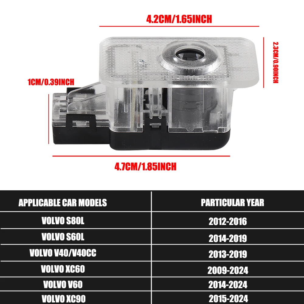 Enhance your vehicle’s style and safety with this set of 2 high-brightness LED car door projector welcome lights, compatible with multiple Volvo models including S80L (2012-2016), S60L (2014-2019), V40/V40CC (2013-2019), XC60 (2009-2024), V60 (2014-2024), and XC90 (2015-2024). Featuring durable ABS construction, each projector uses Cree chips with 5W power consumption and 12V operation, emitting crisp green light with a lifespan over 100,000 hours. The waterproof, dustproof design allows quick, drill-free installation, transforming your vehicle’s entry area into a modern, eye-catching display while ensuring reliable performance in all conditions.