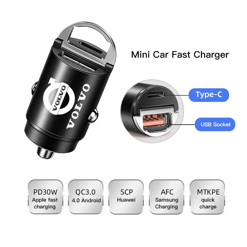 Experience seamless, high-speed charging on the go with this sleek USB Type-C car charger, compatible with a wide range of Volvo models including XC90, V90, V60, XC60, V40, S80, S60, S90, C40, XC40, V70, XC70, C30, C70, and EX90. Crafted from durable zinc alloy and PC, it features dual ports—Type-C with pinkish-red lining and a standard USB—delivering a combined maximum of 5V/5A. The Type-C port supports voltages of 5V/3A, 9V/3A, 12V/2.5A, 20V/3A, and 20V/1.5A for fast charging via Power Delivery 3.0, FCP, SCP, and ARK protocols, ensuring your devices charge quickly and efficiently during every journey.