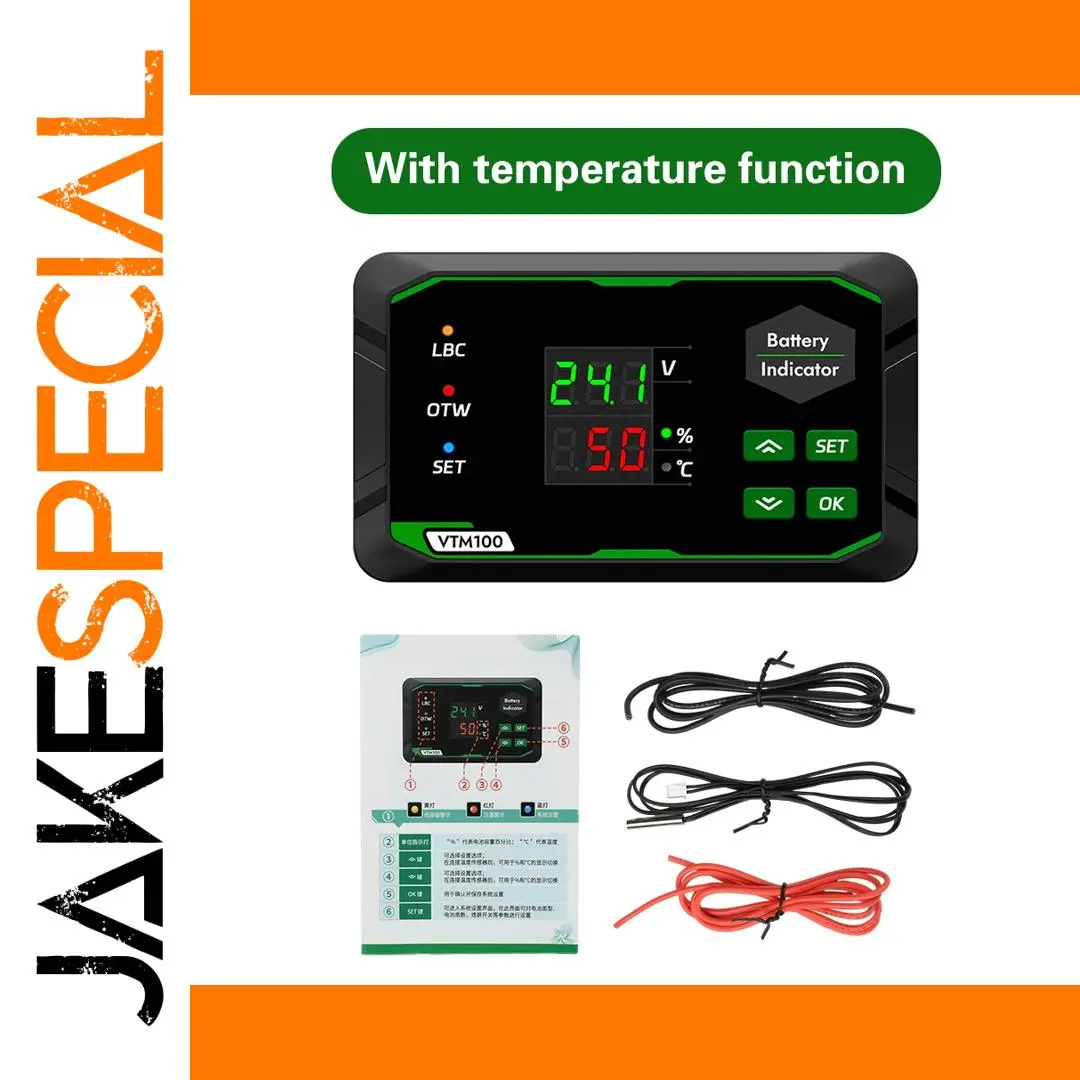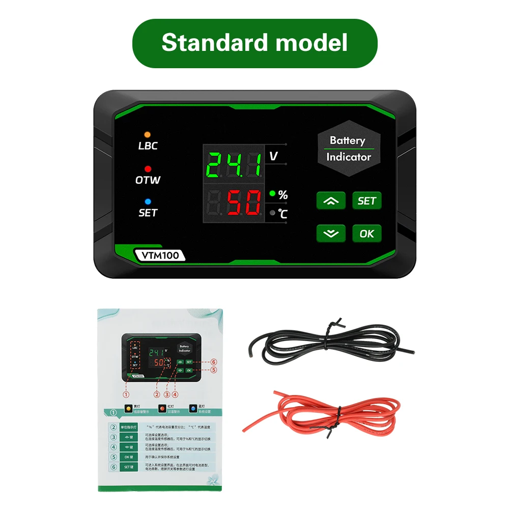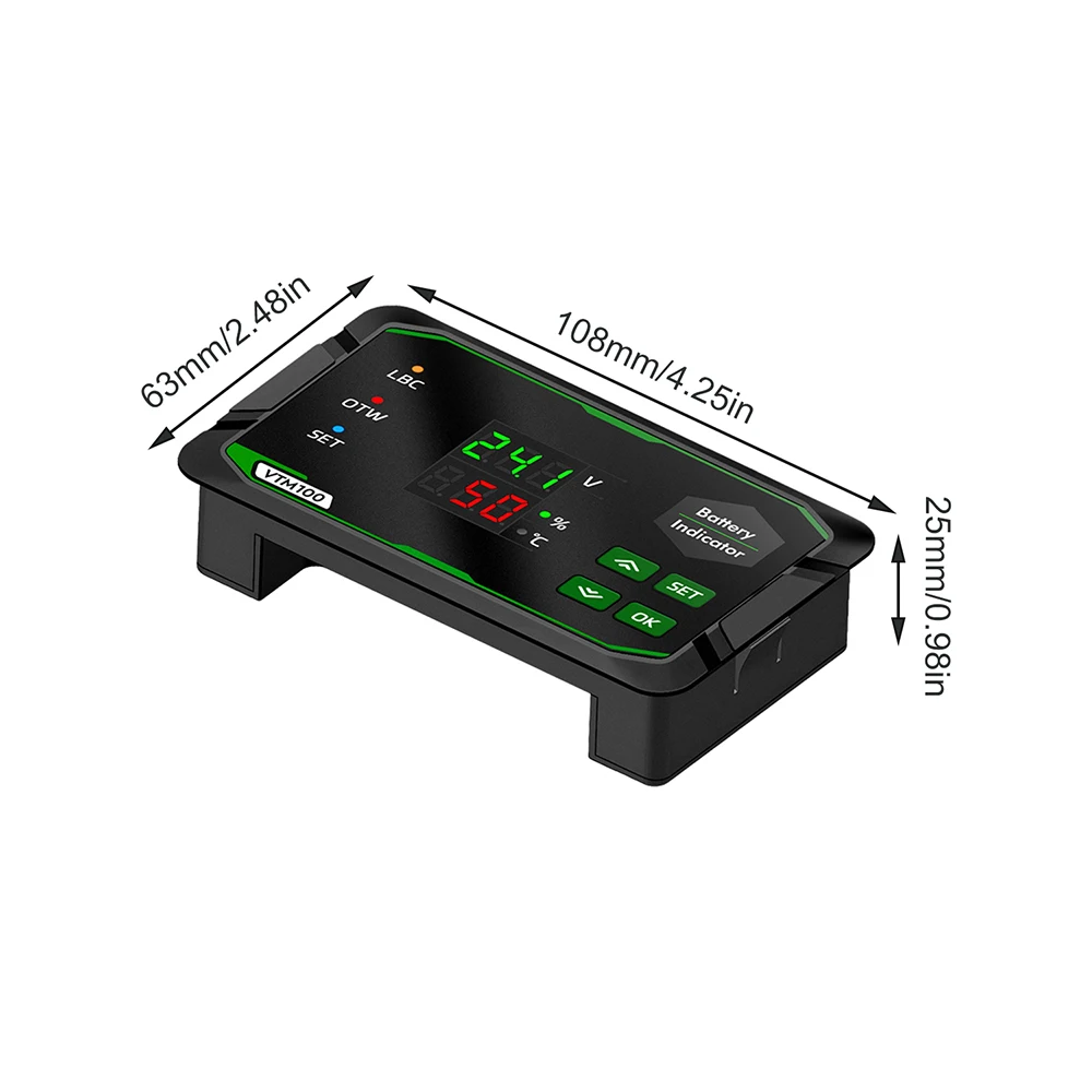 The VTM100 DC Battery Capacity Indicator is a compact, high-precision device designed for monitoring voltage and capacity in batteries ranging from 7V to 100V DC. Featuring a sleek black plastic housing with rounded edges, it combines a bright green LED display for voltage (accuracy ±0.1V) and a red display for capacity percentage (accuracy 0.1%). Supporting lead-acid, ternary lithium, and lithium iron phosphate batteries, it offers adjustable alarms, reverse connection protection, and easy four-button operation. Its dual-screen design, colored indicator lights, and robust specifications make it ideal for electric vehicles and off-grid solar systems, ensuring reliable battery management with clear, real-time data.