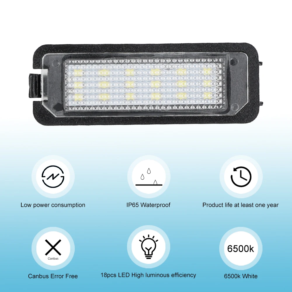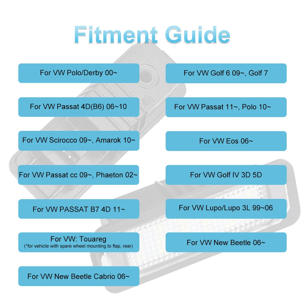- This set includes 2 LED license plate lights with 18 high-power SMD LEDs emitting a 6500K white light for superior brightness and clarity, compatible with numerous VW models from 1999 onward.
