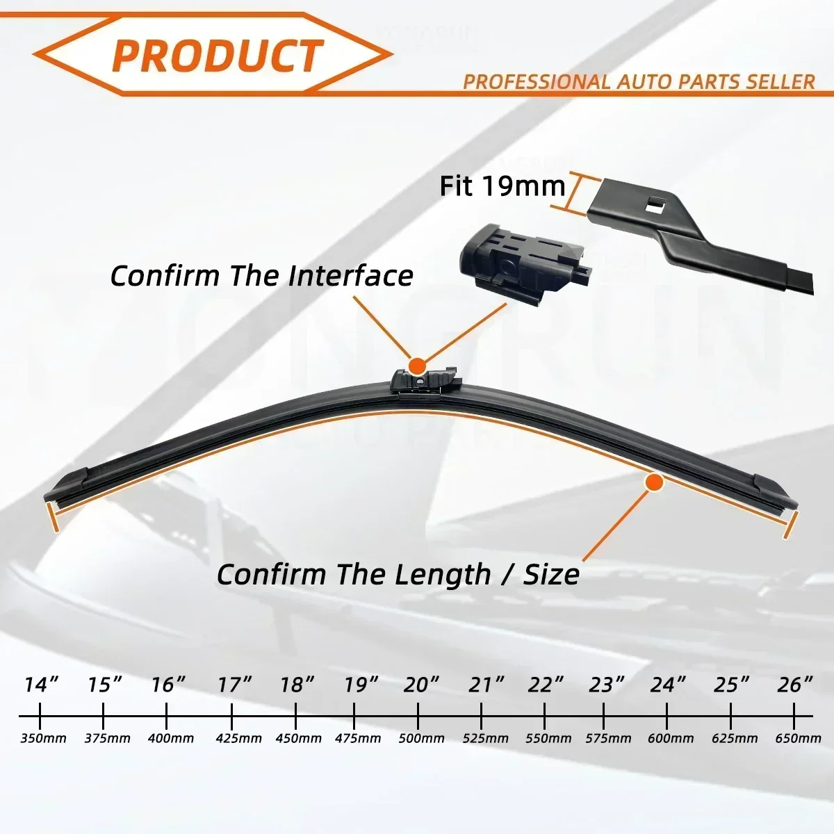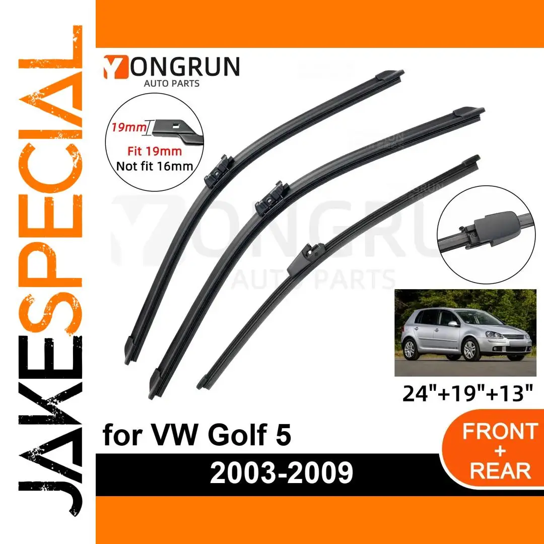 Upgrade your VW Golf 5 (2003-2009) with this set of three high-quality, durable windshield wipers. Featuring 24-inch (600 mm) front blades and 19-inch (475 mm) and 13-inch (325 mm) rear blades, these all-season wipers are crafted from premium natural rubber for long-lasting performance. Designed to handle dirt, dust, snow, and ice, they ensure crystal-clear visibility in any weather. The sleek black frames and precise mounting clips make installation easy and secure, providing a reliable and streamlined look. Perfect for maintaining optimal driving safety and clarity year-round, these wipers are an essential upgrade for your vehicle.
