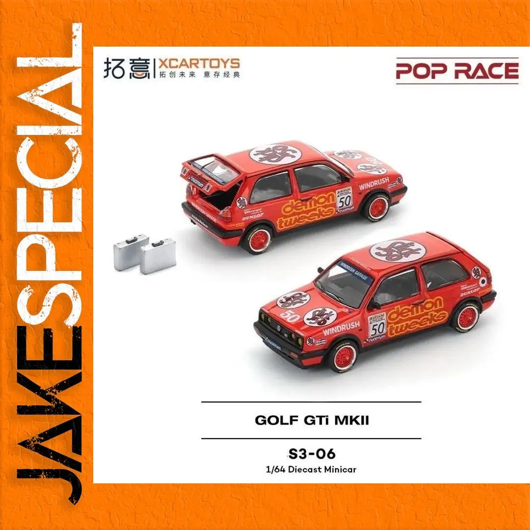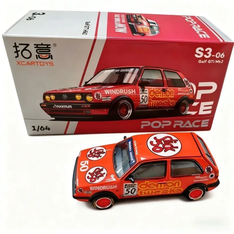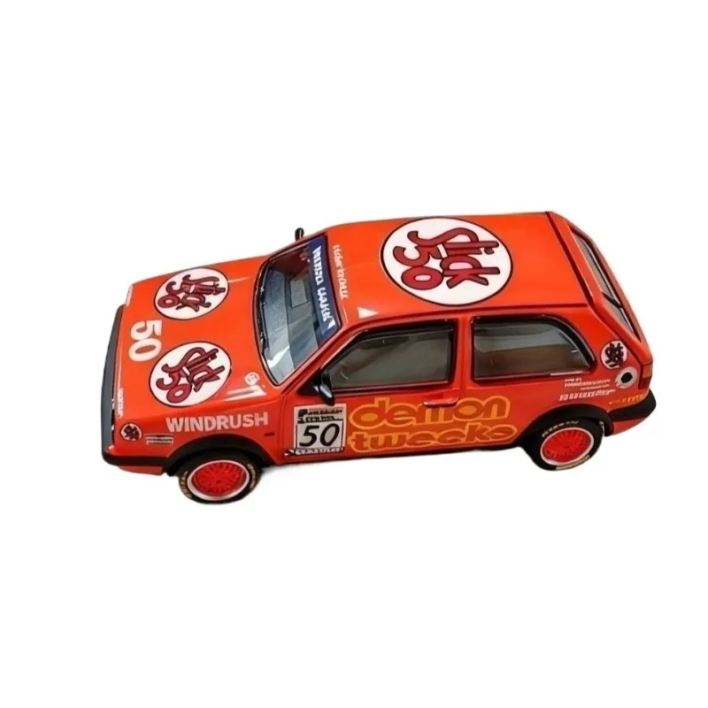 This striking diecast model of the VW Golf GTI Mk2 captures the vibrant energy of this classic car in a stunning red finish. Crafted at a 1/64 scale, it presents a detailed portrayal of the original vehicle with intricate design elements such as the eye-catching circular logo featuring the number “50” and the bold “demon tweeks” text. The model also showcases finely detailed alloy wheels painted silver with red accents, providing a sporty touch. Clear plastic headlights and a detailed mesh grille give it a lifelike front end, while the raised hatchback design allows for a tantalizing view of the minimalist interior. Complete with realistic rubber tires, this model is a perfect addition for enthusiasts and collectors alike.