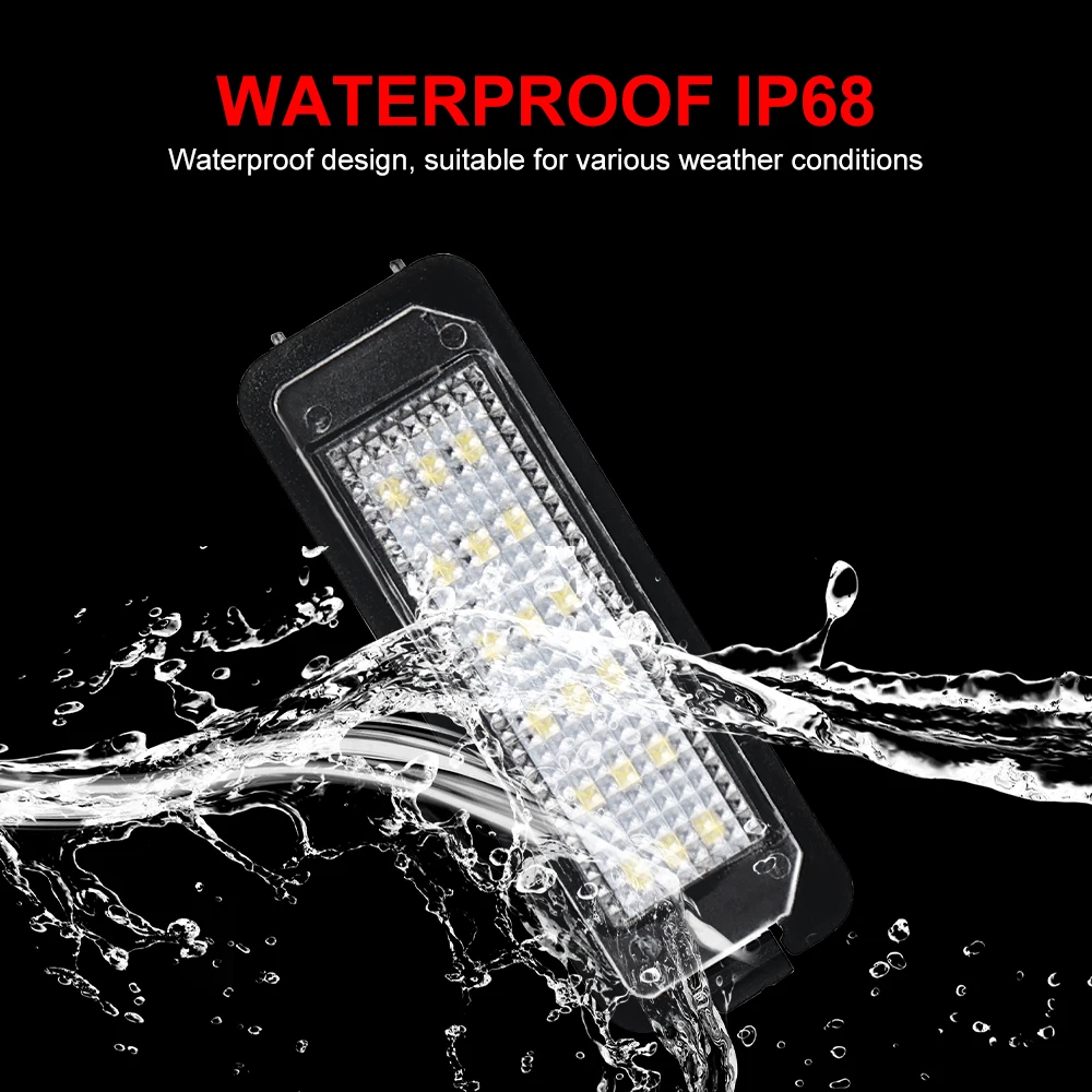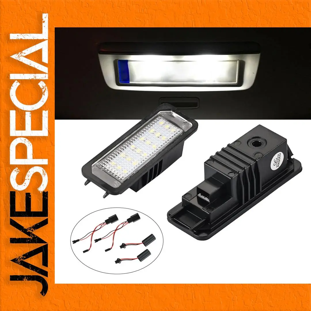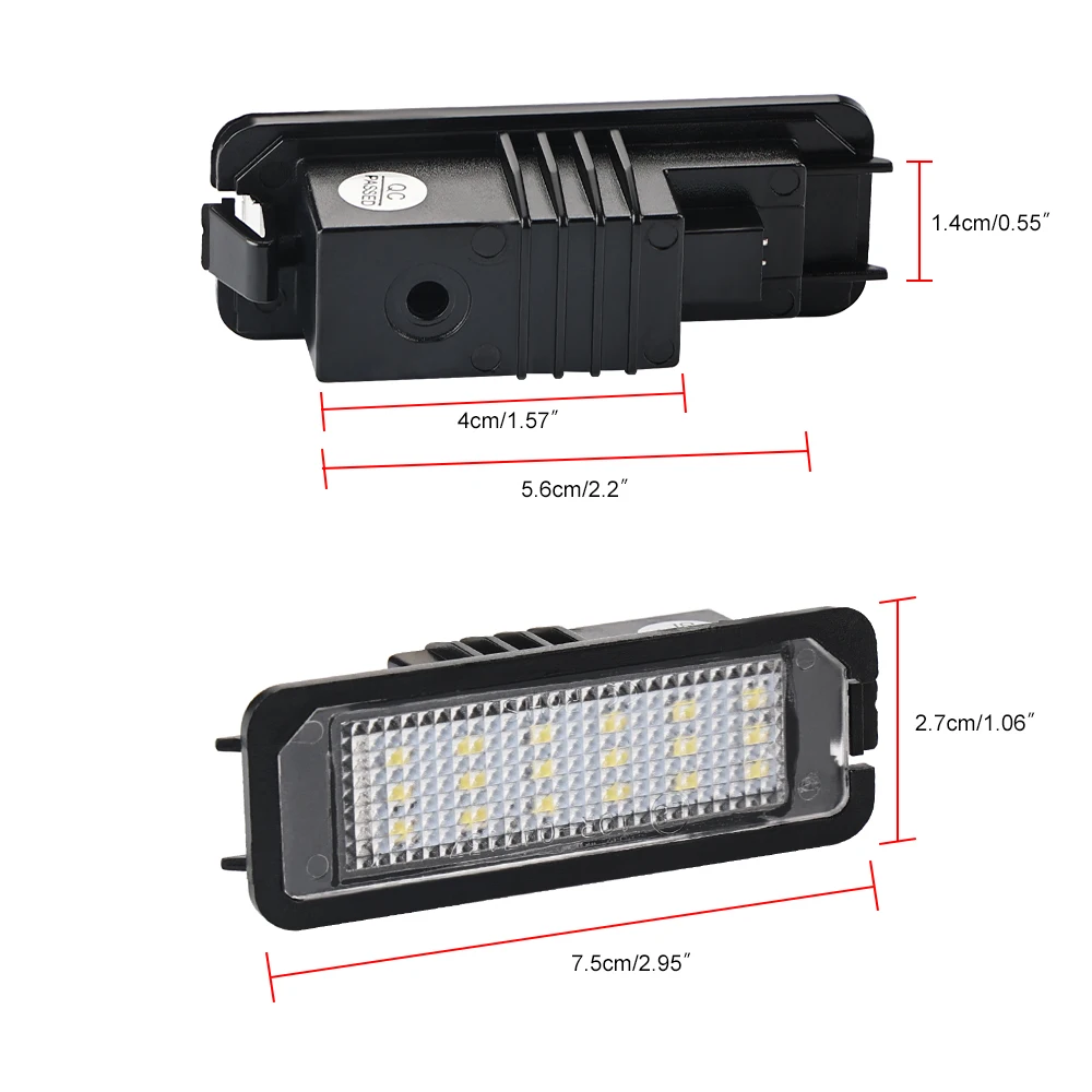 Upgrade your Volkswagen with this pair of high-power 12V SMD LED license plate lights emitting 6500K xenon-white light, designed for models such as Golf 6 (2009~), Golf 7, Passat (2011~), Polo (2010~), Eos (2006~), Golf IV, Lupo, New Beetle, Derby, Scirocco, Amarok, Passat cc, Phaeton, Passat B7, and Touareg (rear, with spare wheel mounting). These sleek, black plastic housings feature transparent covers showcasing evenly spaced LEDs for a clean, modern appearance. Each lightweight lamp (0.085 kg) offers easy plug-and-play installation, delivering bright, clear visibility without error warnings or reprogramming. Certified CE and RoHS, ensuring safety and quality for hassle-free vehicle enhancement.