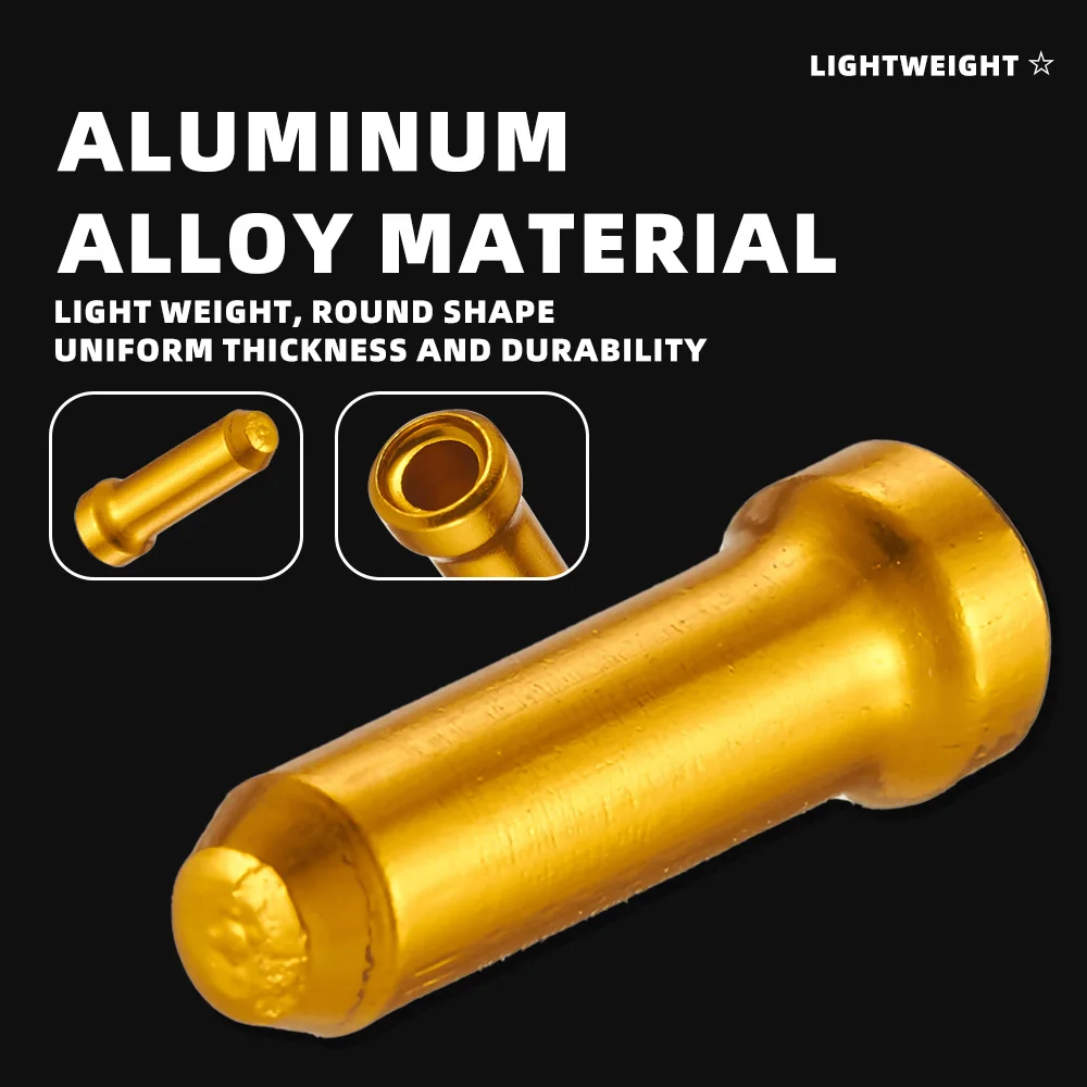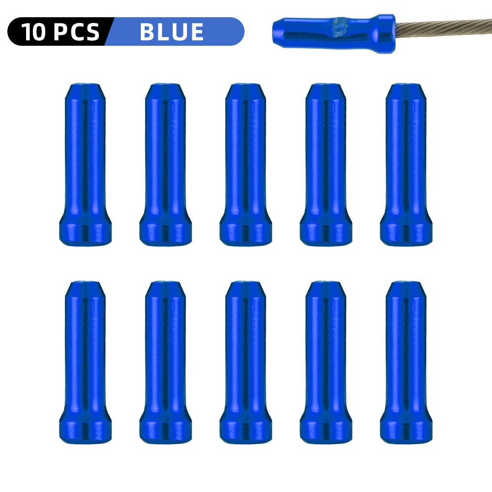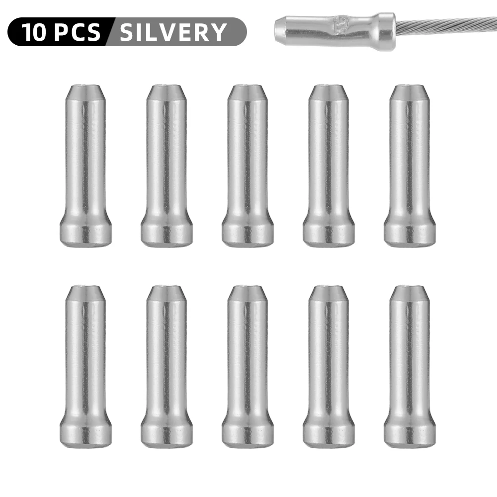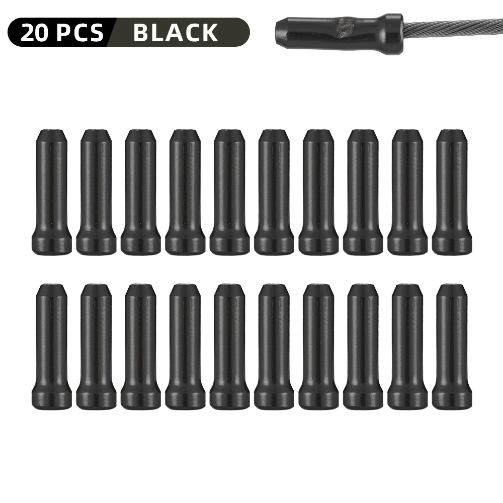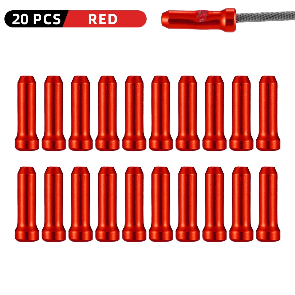 Enhance your bicycle’s cable management with these aluminum tail end caps, designed for brake and shift wires. Available in vibrant colors—black, blue, golden, red, and silvery—in packages of 10 or 20 pieces, these crimped line caps securely finish wire ends, providing durability and a customized look. Crafted from high-quality aluminum with a smooth, shiny metallic finish, these caps feature a slightly tapered, rounded tip and a wider base for easy crimping. Perfect for cyclists seeking a stylish, functional upgrade, they ensure reliable cable protection and identification, adding a polished touch to your bike’s appearance and performance.
