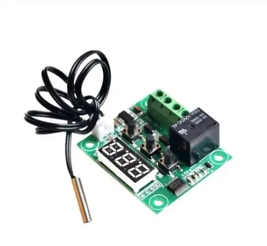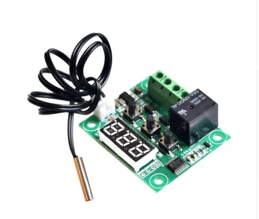 Experience reliable temperature management with this all-in-one W1209 Mini Thermostat. Its compact rectangular design, measuring just 48mm by 40mm with a height of 14mm, seamlessly fits into various projects. The vibrant green base and sleek black relay contrast sharply with a clear, waterproof NTC sensor, providing an elegant yet practical aesthetic. The bright LED display offers easy-to-read numerical data, and the transparent enclosure showcases its high-quality components. Ideal for incubators, refrigeration, or environmental control systems, this thermostat combines technical precision with a modern look. Its waterproof sensor and robust relay make it a durable, versatile choice for adult enthusiasts seeking accurate temperature regulation in a compact form factor.