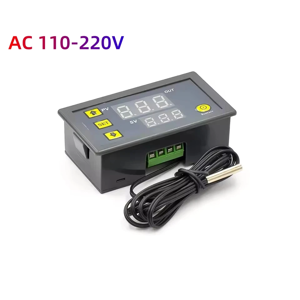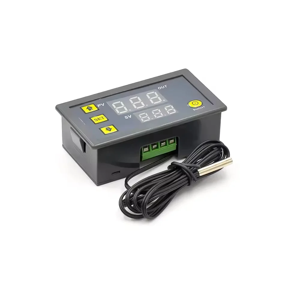 Experience seamless temperature management with this W3230 digital thermostat, designed for reliable adult use in various settings. Its sleek, rectangular grey casing houses an easy-to-read LED display that offers instant temperature readings. The bright, centralized digits glow vividly against a black background, ensuring clarity even from across the room. Featuring a waterproof NTC 10K sensor, it measures temperatures from -50°C to 120°C with a precision of 0.1°C, perfect for applications needing fine control. The device supports high-power loads with a relay capacity of 20A at 220V, making it ideal for heating and cooling systems. Its modern, minimalistic aesthetic combines functionality with style, fitting seamlessly into technical environments or home setups requiring exact temperature regulation. Let this thermostat bring precision and peace of mind to your equipment.