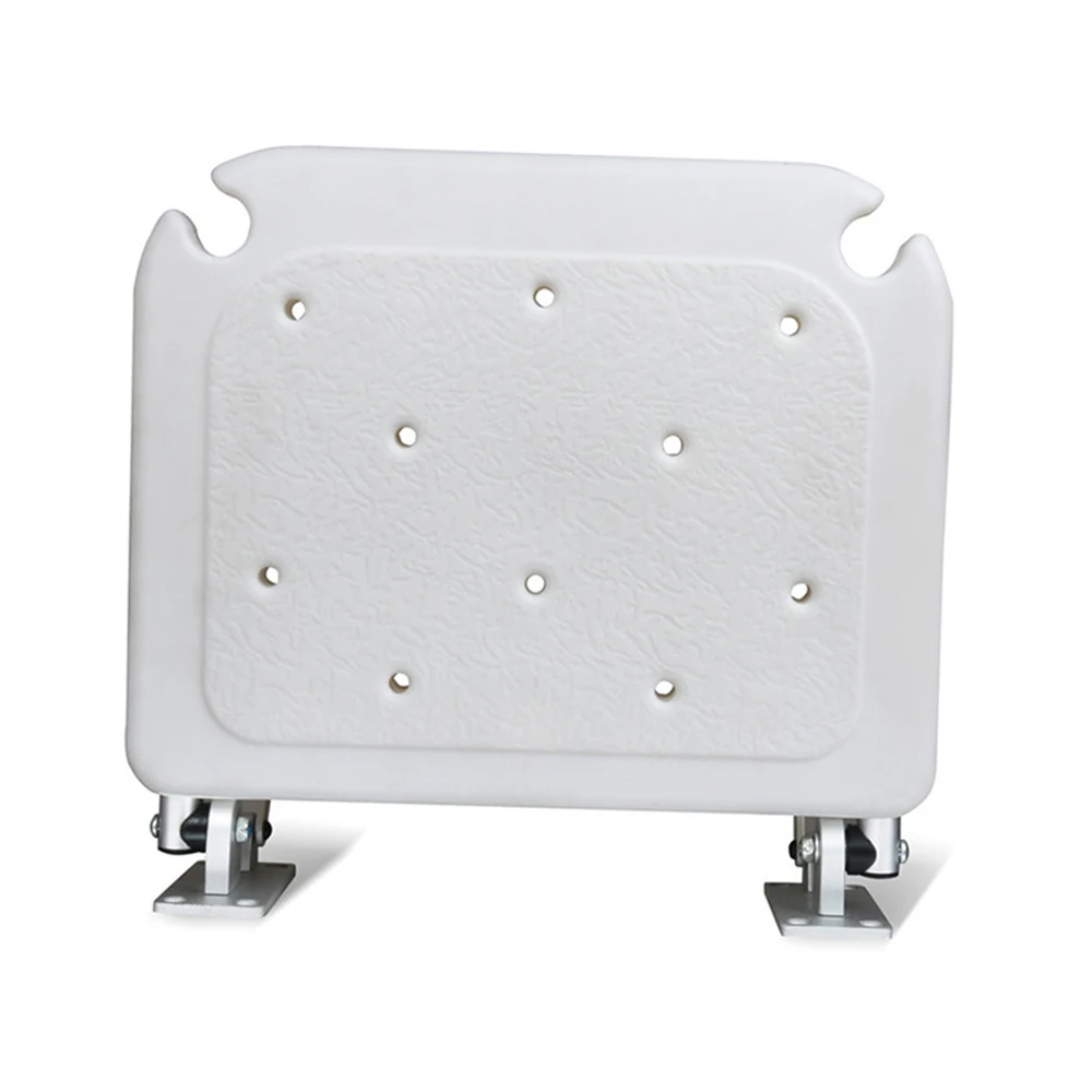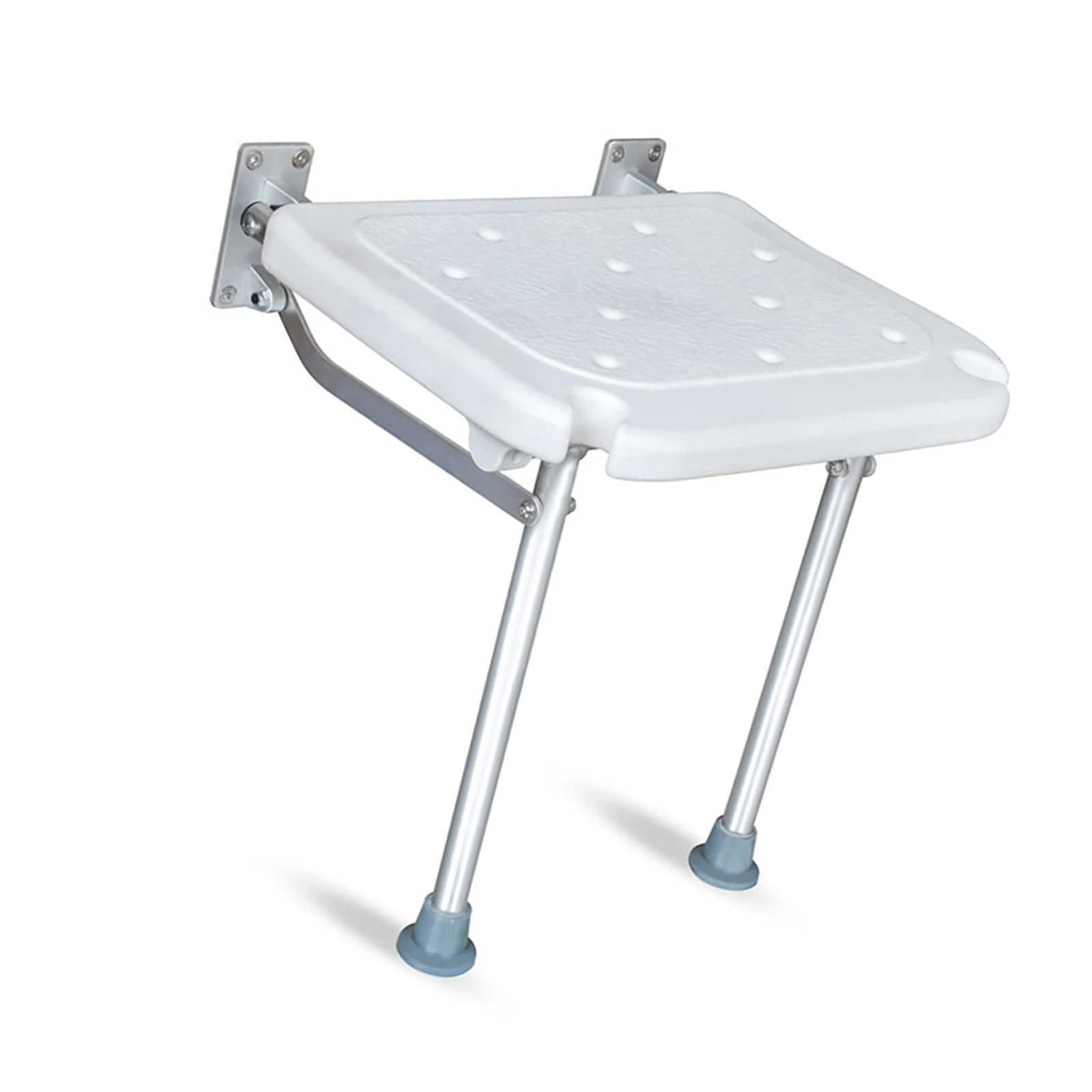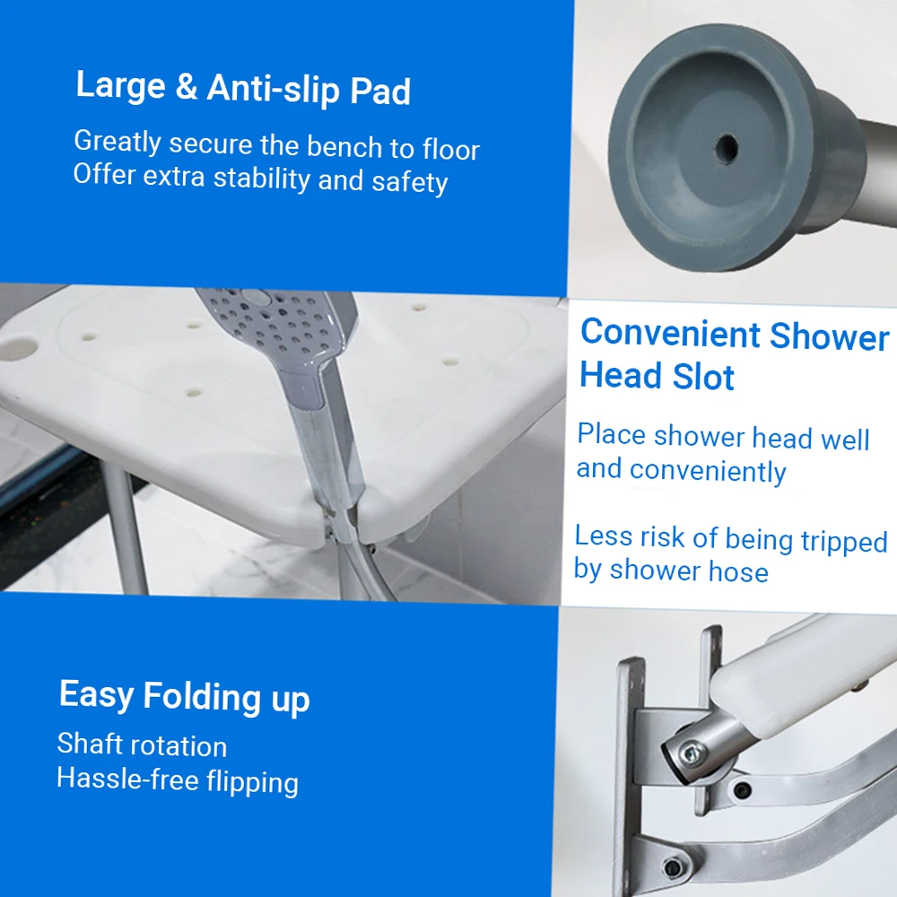 This white, wall-mounted folding shower bench is crafted from durable aluminum alloy and ABS materials, supporting up to approximately 200kg (440 lbs). Measuring 40cm x 32cm x 42cm (15.74in x 12.58in x 16.53in), it features a textured seat with drainage holes for water runoff, non-slip feet with pads for added stability, and two slots to hold a shower head. Its flip-up design allows the bench to fold vertically against the wall, saving space while maintaining a sleek, modern appearance. Ideal for elderly, disabled, or individuals with limited mobility, it offers a secure, comfortable seating solution for safe showering.