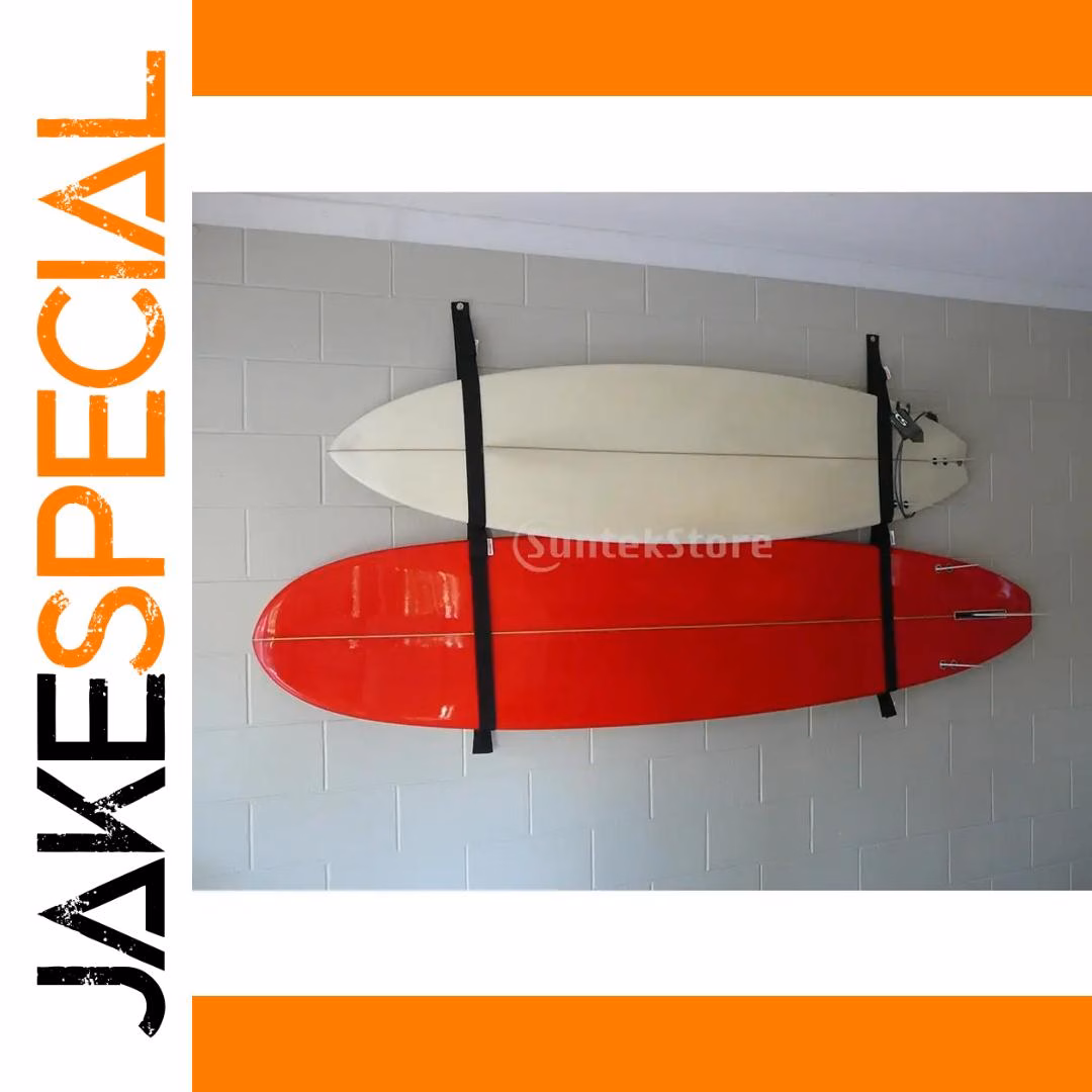 Transform your space with this sleek, minimalist wall-mounted surfboard storage system. Designed to securely hold two boards, it combines functionality with modern aesthetics. The black polyester straps with nickel-plated eyelets ensure a strong and durable hold, while the simple installation process makes mounting quick and easy. Imagine proudly displaying your longboards, skateboards, or snowboards cleanly against your wall, saving space and creating a stylish showcase. The system's compact design keeps your gear organized and accessible, reducing clutter in your home, garage, or shed. Its versatile design allows hanging high or low, fitting seamlessly into any decor. You’ll love the tidy, contemporary look it adds while protecting your boards during storage.