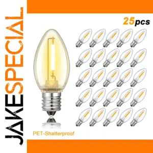 Imagine transforming your space with this set of 25 elegant, candle-shaped LED bulbs designed for both indoor and outdoor settings. Crafted from durable, shatterproof PET plastic, these bulbs feature a sleek transparent shell that displays the internal filament-like LEDs glowing with a warm yellow-orange hue, effortlessly adding charm to your holiday decor, garden, patio, or special events. Their minimalist design with shiny metal bases provides a modern touch, while their energy-efficient operation ensures you enjoy bright, inviting lighting without high energy costs. With a lifespan of up to 15,000 hours and waterproof IP44 rating, they promise long-lasting, reliable performance in any weather condition. Easy to install, these bulbs will enhance your decorative lighting with style and functionality.