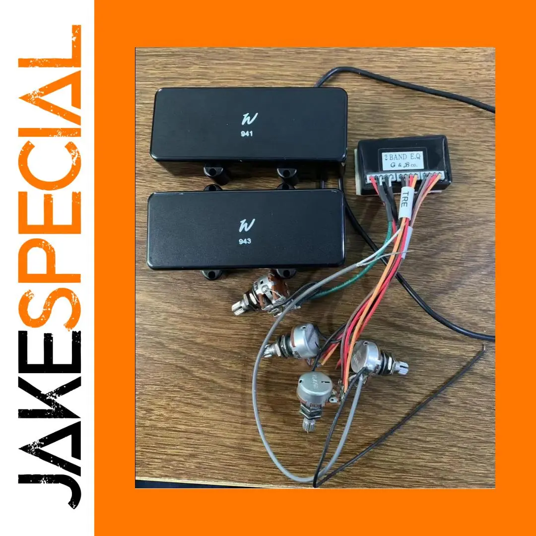 Experience the enhanced sound quality and professional performance of this this Washbun 4-string bass guitar active pickup system. Crafted with precision, it features two sleek, matte black rectangular pickups labeled “941” and “943” with white branding, providing a modern and minimalistic aesthetic. The compact preamp circuit housing displays a clean, boxy design with clearly labeled controls, ensuring straightforward adjustments. Equipped with colorful wiring of white, orange, red, black, and gray for organized and vibrant connectivity, this set offers a seamless upgrade to your instrument. Built in Korea with durable materials, it’s designed to deliver consistent tone clarity and dynamic response, perfect for musicians seeking reliable and high-quality electronics for their bass. Elevate your playing with this professional package, ready for installation on compatible 4-string Washbun bass guitars.