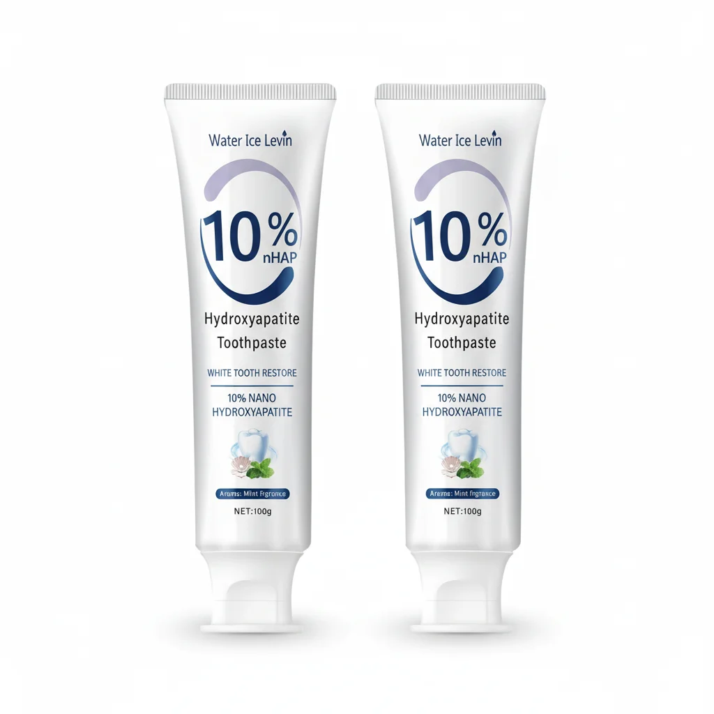 Experience a brighter, healthier smile with this 100g Water Ice Levin Nano Hydroxyapatite Toothpaste, formulated with 10% nano hydroxyapatite for deep cleaning, whitening, and gum protection. Its sleek, minimalist design features a white tube accented with mint leaves and a tooth graphic, symbolizing freshness and advanced dental care. Enriched with ingredients like aqua, glycerin, ascorbic acid, ceramide, and menthol, it offers a refreshing mint aroma while being free of high-concern chemicals. Perfect for adults seeking to restore whiteness, maintain oral health, and achieve a radiant smile with a modern, high-tech aesthetic.