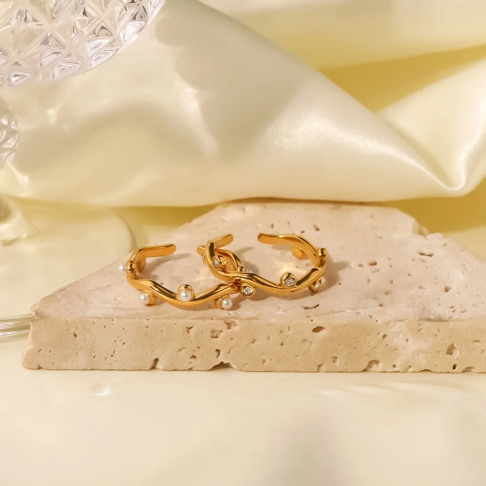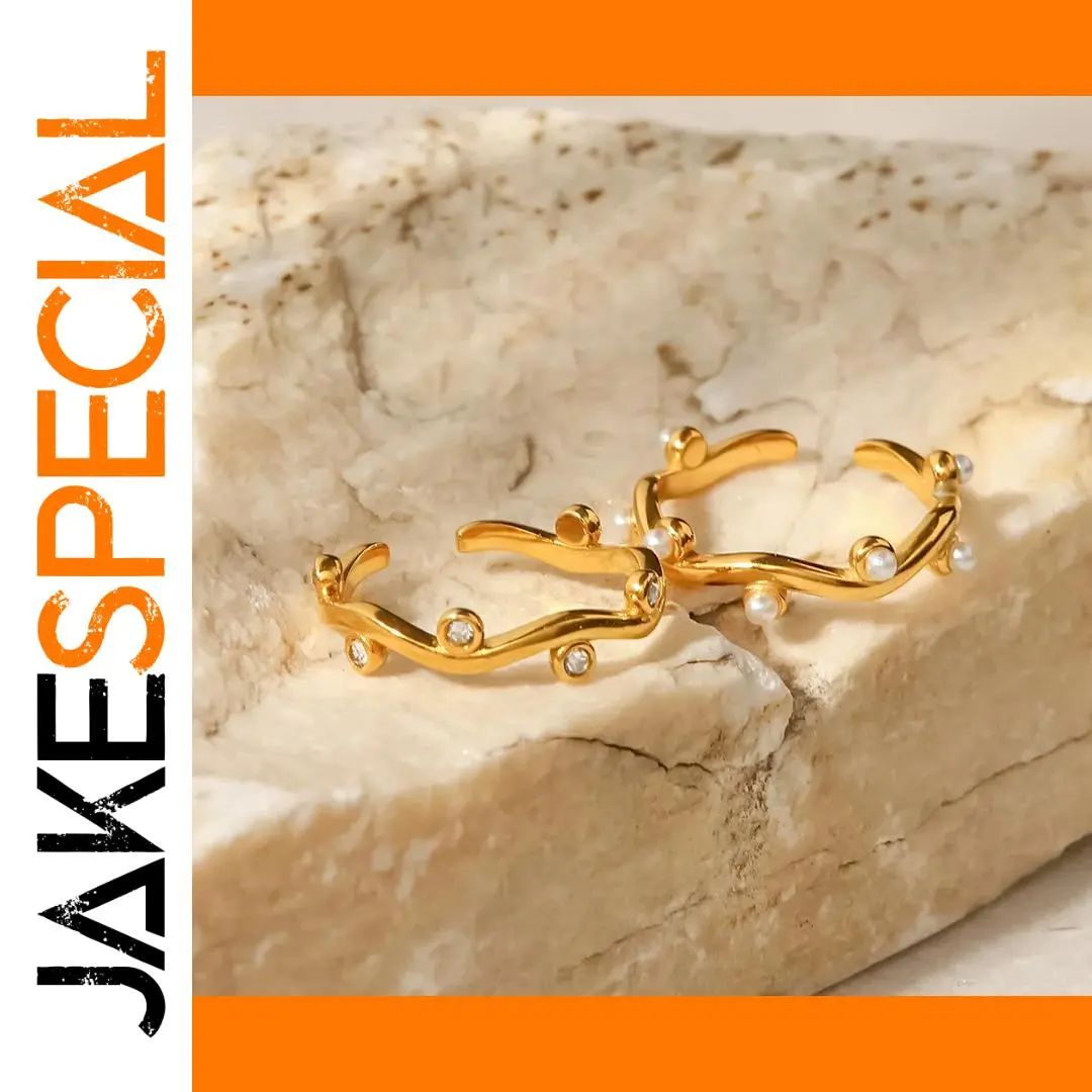 Experience the timeless charm of this pair of water wave-shaped earrings, expertly crafted from stainless steel with a luxurious gold PVD finish. Designed to evoke a modern yet organic aesthetic, these earrings feature flowing, irregular wave shapes adorned with delicate white pearls. The polished, reflective gold surface provides a sophisticated look, perfect for both daily wear and special occasions. Their unique, dynamic design catches the light beautifully, adding a touch of elegance to any outfit. With clip-on open ends, they promise a comfortable and adjustable fit. Lightweight and waterproof, these earrings combine style with durability, making them a reliable accessory for those who love trendsetting jewelry with a luxurious feel.