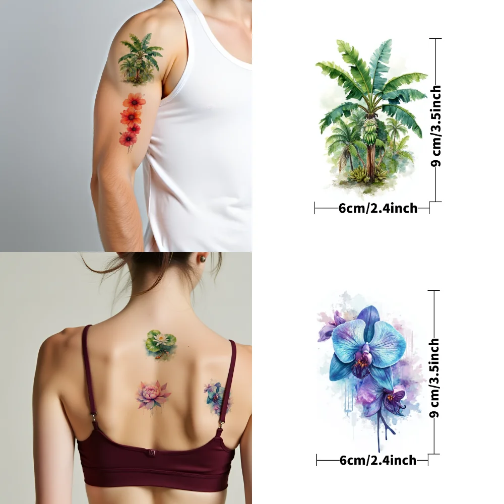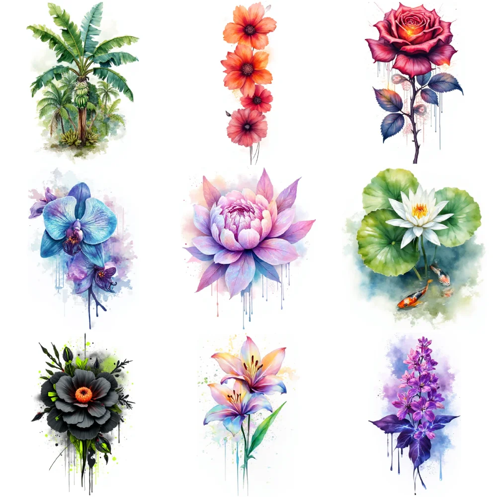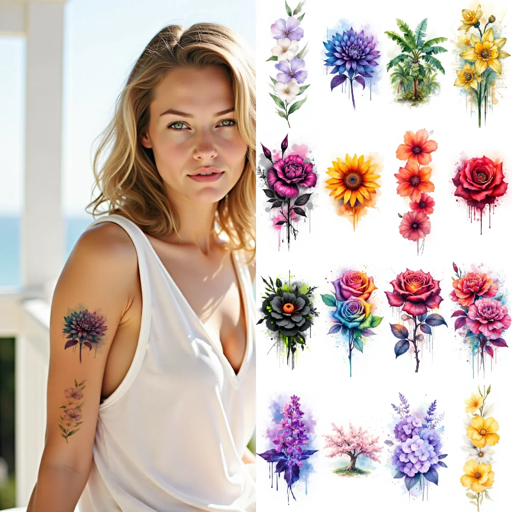 Enhance your look with this set of 9 waterproof watercolor floral tattoo stickers, each measuring approximately 9 x 6 cm. Designed for arms, body, and legs, these vibrant 3D body art tattoos last 3 to 7 days and are perfect for all seasons and occasions like parties, birthdays, and holidays. Easy to apply in just 30 seconds with a wet sponge or cloth, they can be removed effortlessly with alcohol or BB oil. Suitable for ages 14 and older, these tattoos contain no high-concern chemicals, offering a safe and stylish way to express your artistic side during special events or everyday moments.