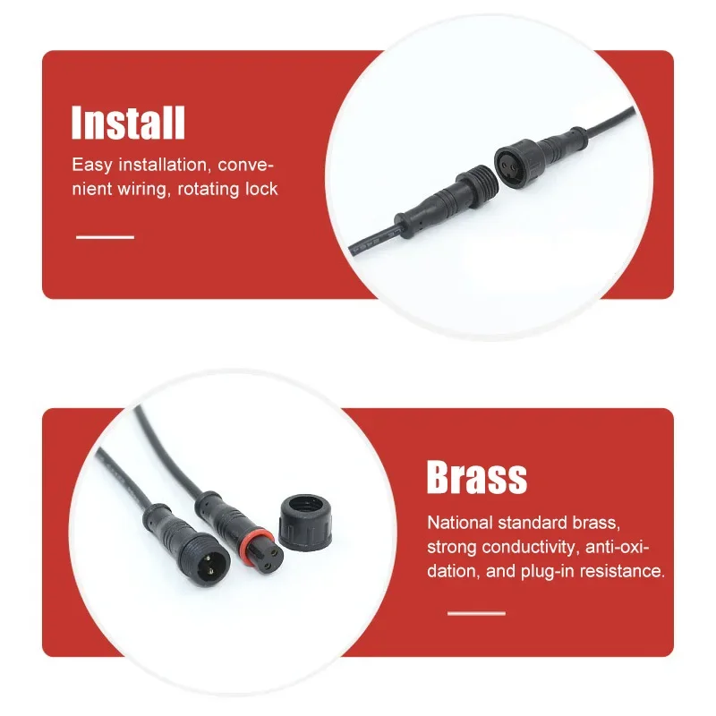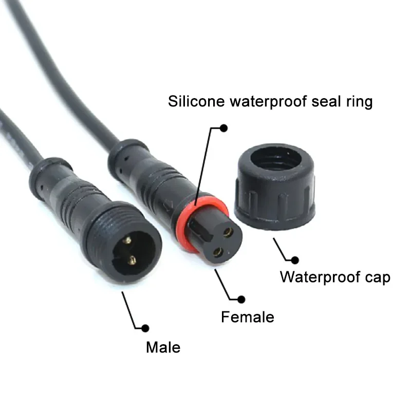 Experience reliable outdoor electrical connections with this this waterproof docking connector, designed for durability and ease of use. Crafted with a sleek cylindrical shape and matte black finish, it features textured locking rings for a secure grip. The front features small, circular metal pins arranged precisely in configurations of 2, 3, or 4 pins, ensuring versatile compatibility. The transparent or translucent tips reveal the red and black conductors inside, illustrating craftsmanship and technical precision. Made with thickened brass cores housed in tough PA66 material, it is rated IP67 for full waterproof protection. With a line length of 20cm, this connector is perfect for solar lights, automotive wiring, and outdoor electrical projects. Its minimalistic design ensures it blends seamlessly into any setup while providing maximum functionality.
