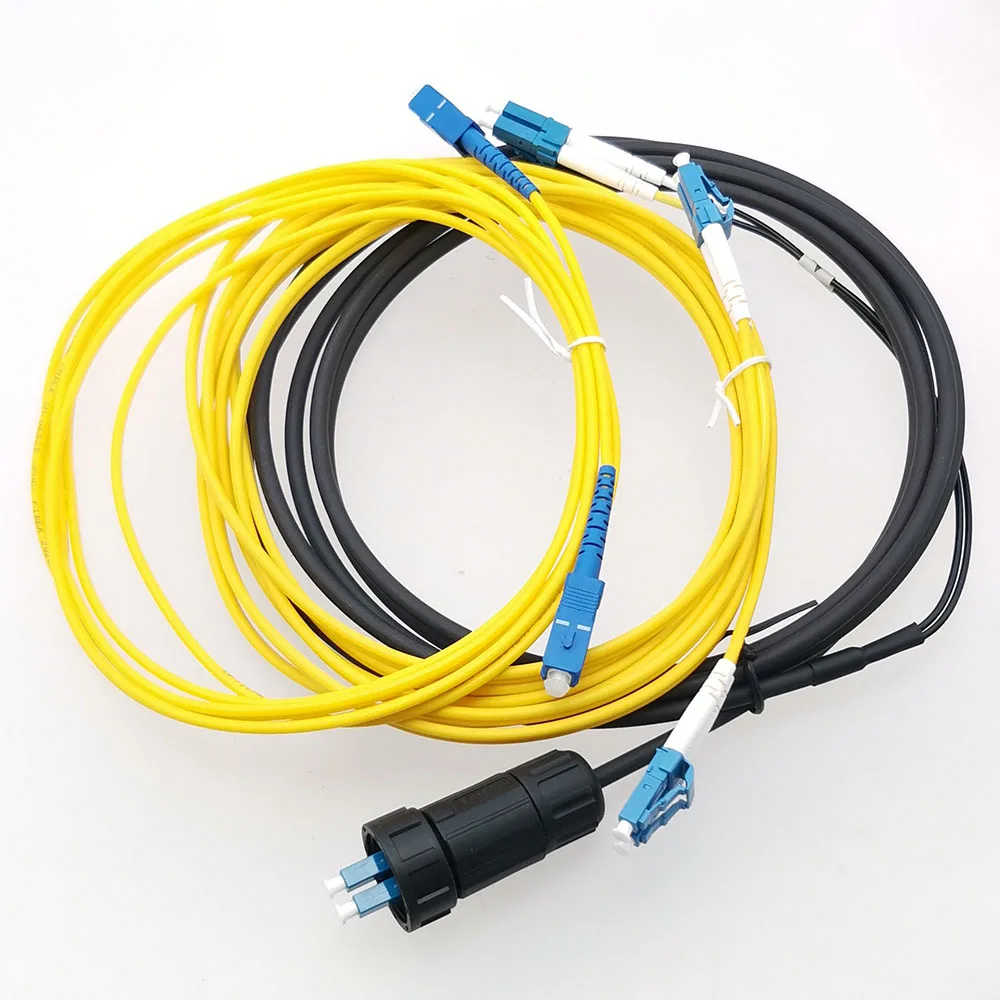 Experience seamless and reliable fiber optic connections with this waterproof fiber patch cable. Designed for outdoor and harsh environments, it combines durability with high-performance features. The 3-meter black outer sheath ensures robustness, while the vibrant blue SC connector and white and blue duplex LC connector add a sleek, professional aesthetic. An additional yellow fiber pigtail enhances flexibility for splicing and testing. Ideal for single-mode fiber networks, this cable supports voltage levels from 5V to 30V, making it versatile for various industrial applications. Its waterproof build guarantees environmental sealing, reducing maintenance needs and ensuring consistent data transmission in demanding settings. Invest in this reliable cable for your critical network infrastructure needs, knowing you have a durable, high-quality connection solution at your fingertips.