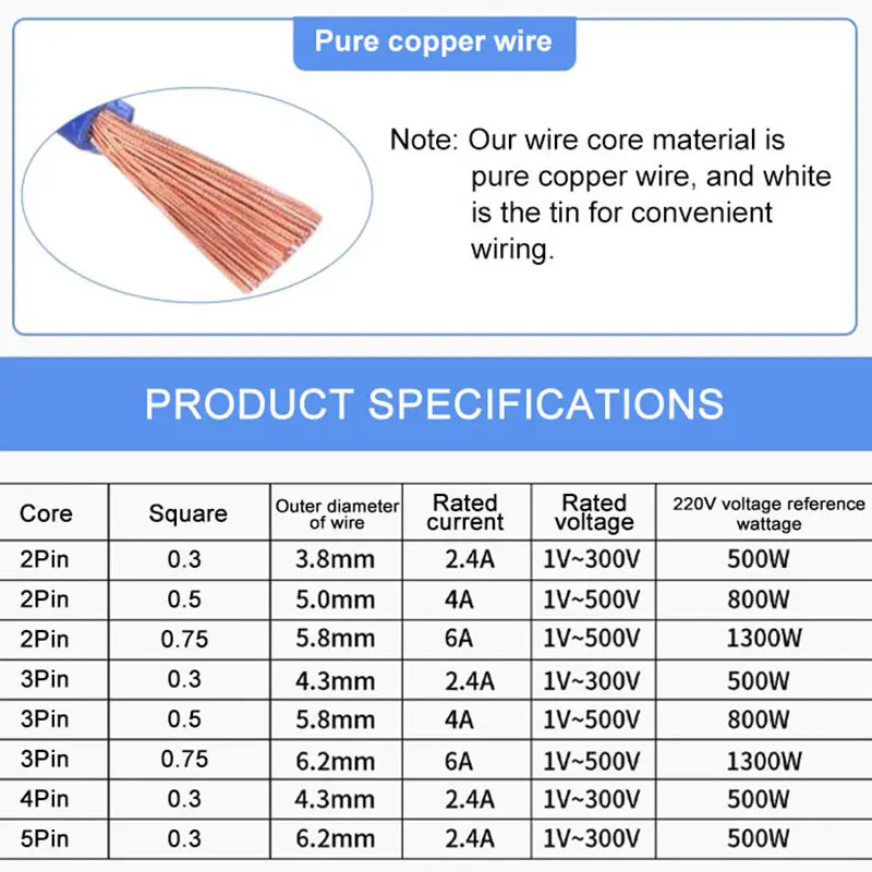 - Available in configurations from 2-pin to 5-pin, supporting wire cross-sections of 0.3, 0.5, and 0.75 mm² for flexible electrical connections.