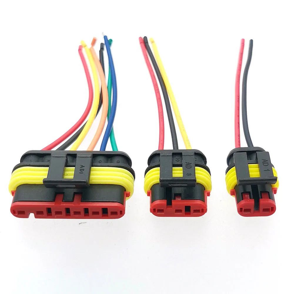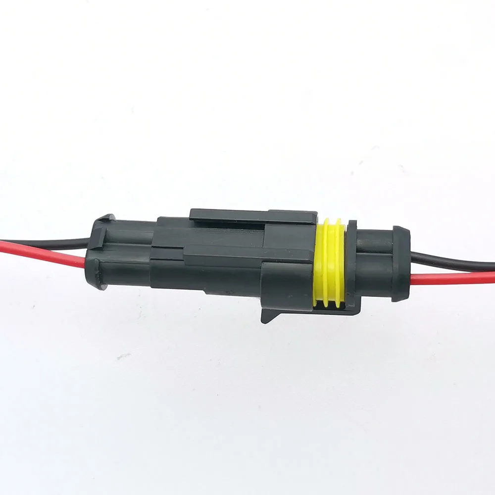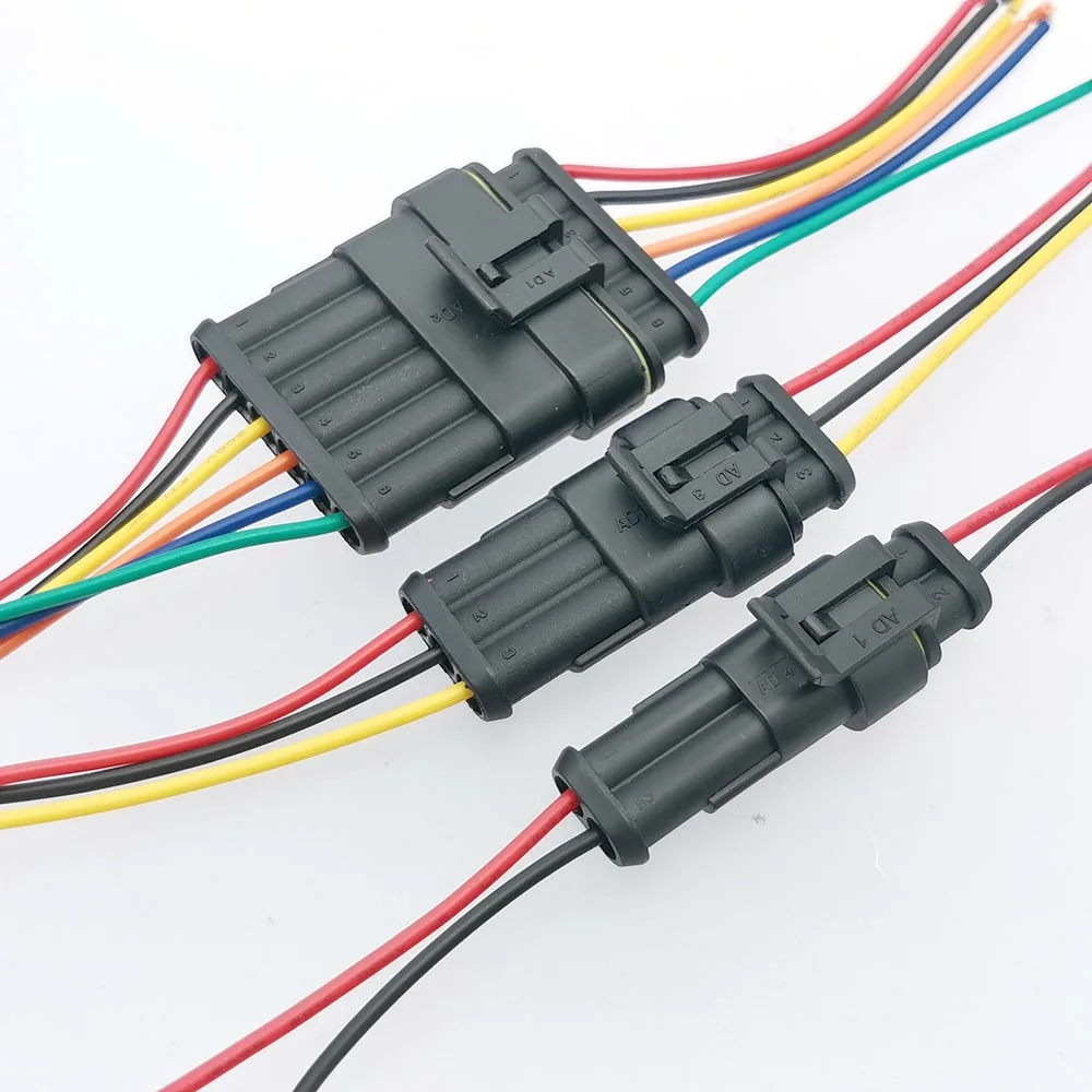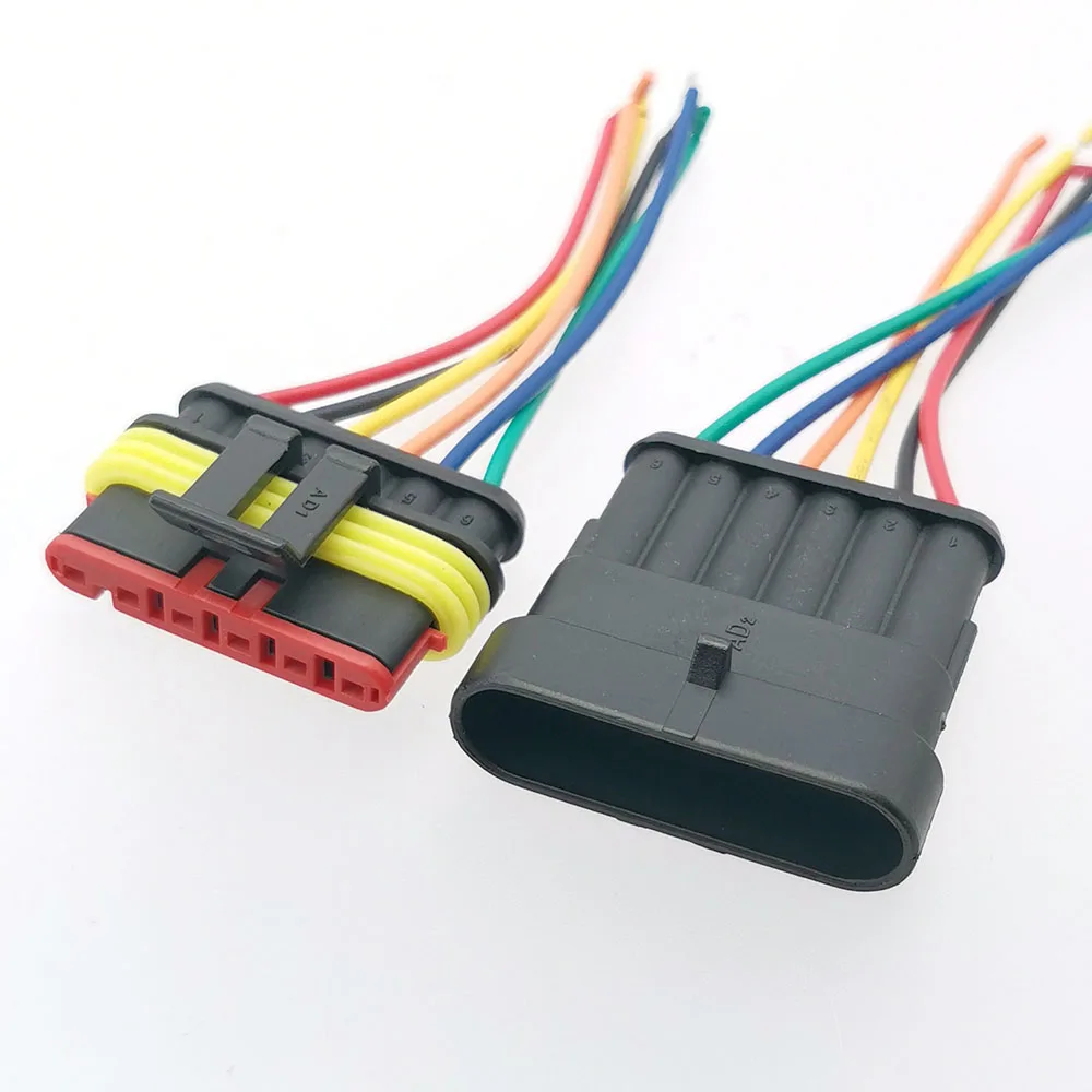 Experience reliable connectivity with this waterproof electrical auto connector set, featuring male and female plugs in 2P, 3P, 4P, 5P, and 6P configurations, designed for secure automotive and motorcycle applications. Built with durable, insulating black cylindrical housings boasting a smooth matte finish and subtle ridges for grip, these connectors include brightly colored wires—red, yellow, black, blue, and green—that enhance visual clarity and ease of installation. Rated for voltages up to 30V, they are ideal for demanding environments, providing waterproof protection, secure locking mechanisms, and precise pin arrangements to ensure safe, stable, and durable electrical connections in your vehicles.