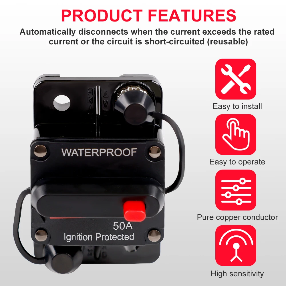Imagine the peace of mind knowing your electrical system is protected by this durable, easy-to-use waterproof circuit breaker. Its robust design and adjustable current rating mean you'll enjoy reliable operation in all conditions. Whether installing in a vehicle, boat, or RV, this device ensures safety and efficiency. Take the next step and secure your system today — it’s a trusted choice for professionals and enthusiasts alike. Protect your valuable electronics with a dependable, waterproof solution that’s built to last.