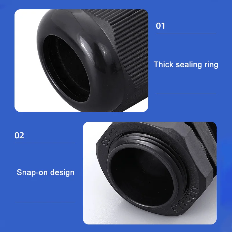 - Features a threaded installation system with ribbed, textured sections for firm grip and easy tightening, ensuring a tight, secure connection in distribution boxes or hardware setups.