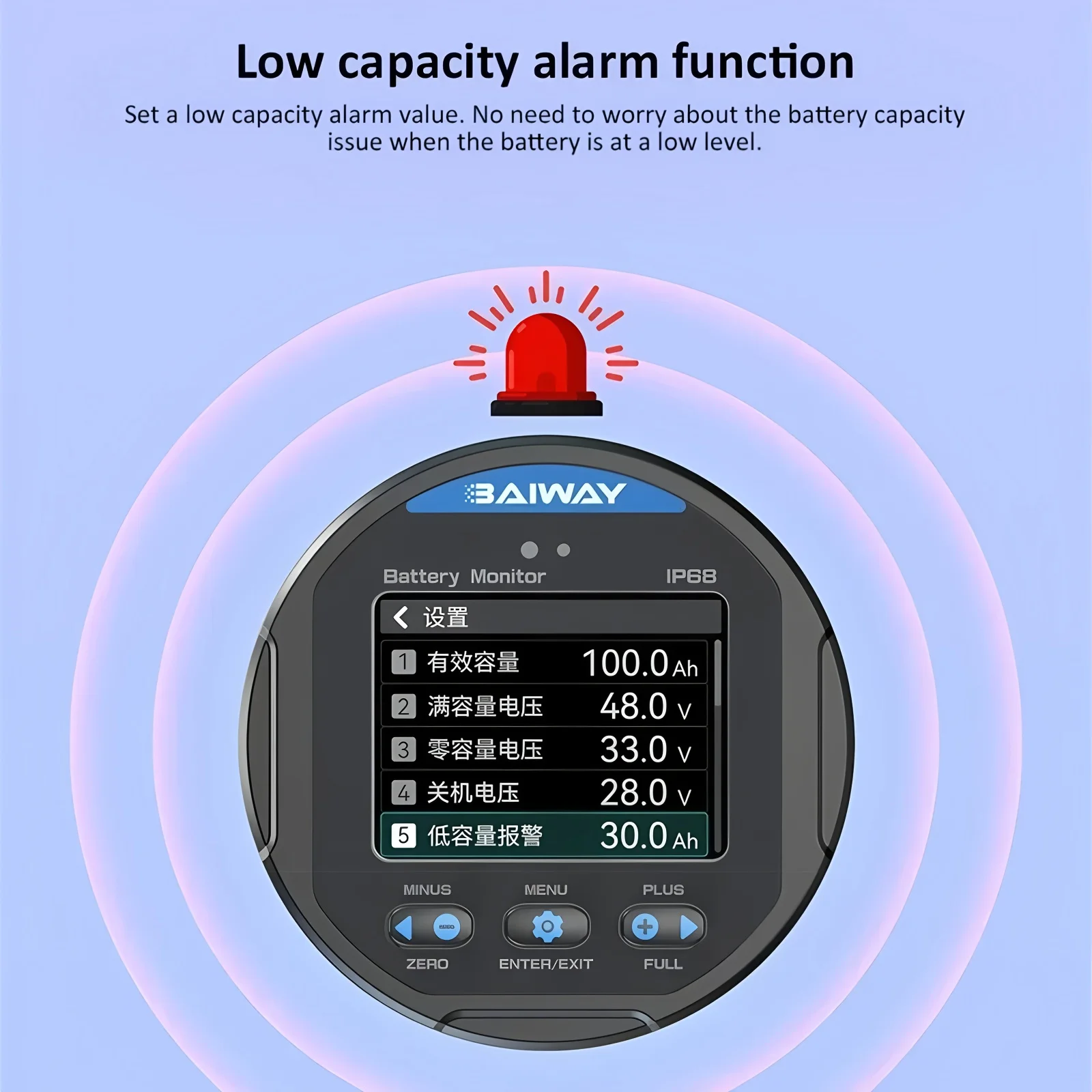 - Features a low capacity alarm for critical low battery warning, automatic/manual backlight modes for optimal visibility, and supports a capacity range from 0.1 to 1000Ah for various battery configurations.