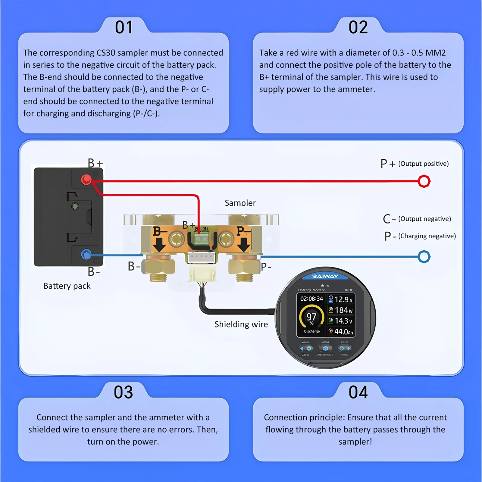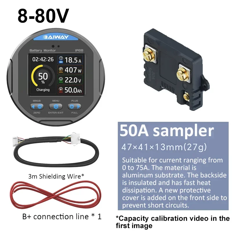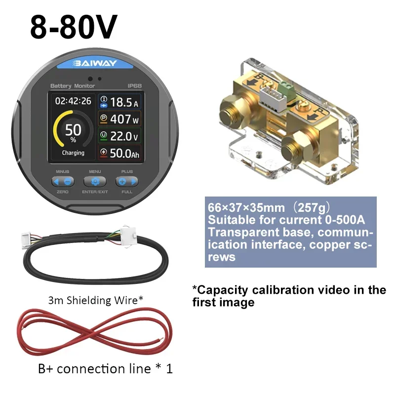 - High-precision measurement of voltage, current, power, and capacity across a range of 8-80V and up to 350A; ideal for various battery types including lithium, lead-acid, and nickel hydrogen.