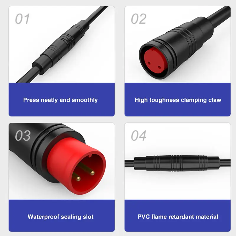 This innovative waterproof connector boasts a modern cylindrical design with a smooth black plastic exterior, offering a clean and minimalist appearance. Its glossy finish enhances its sophisticated look, making it suitable for professional electrical setups such as solar panels and smart home systems. The internal contact points are highlighted with vibrant red elements, sharply defined to ensure precise connections and durability. Available in both M6 and M8 models, the connector accommodates 2 to 6 pins, providing versatile wiring options. Its compact dimensions and waterproof sealing ensure reliable performance even in challenging environments. This connector combines style with functionality, offering a high-tech aesthetic that integrates seamlessly into modern electrical installations. Its robust construction guarantees safety, stability, and long-lasting service life.