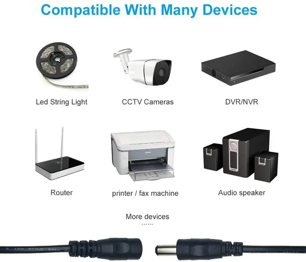- Compatible with LED strips, CCTV security cameras, DVR systems, routers, and other 12V DC-powered devices.
