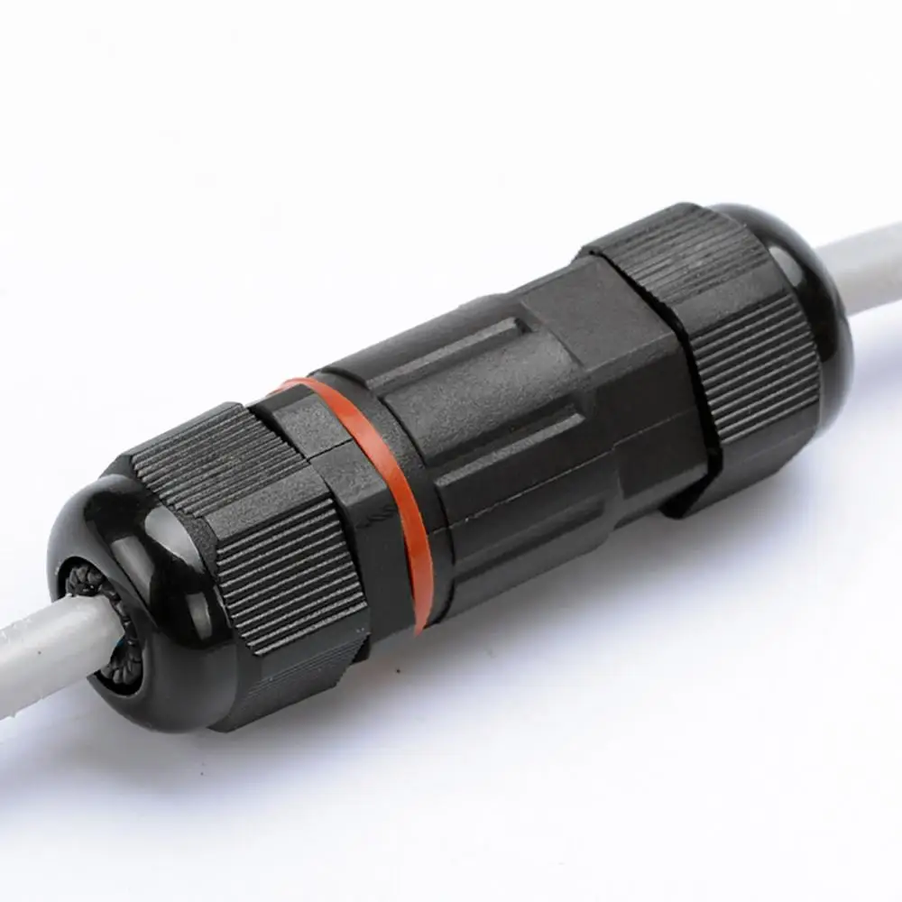 This waterproof cable connector offers a sturdy, industrial design ideal for demanding environments. Crafted in matte black with a textured, ribbed surface, it ensures a secure grip during installation and handling. The cylindrical shape features visible threading for a tight, secure fit, with a ridged, cap-like end for convenient access to internal wiring. An eye-catching orange rubber gasket enhances waterproof sealing, protecting against dust and water immersion up to 10 meters. Designed for wire diameters of 6-12mm, it supports voltage up to 250V and a current of 16A. Available in 2-pin and 3-pin configurations, this versatile connector is perfect for electrical junctions requiring reliable, sealed connections in wet or underwater conditions.