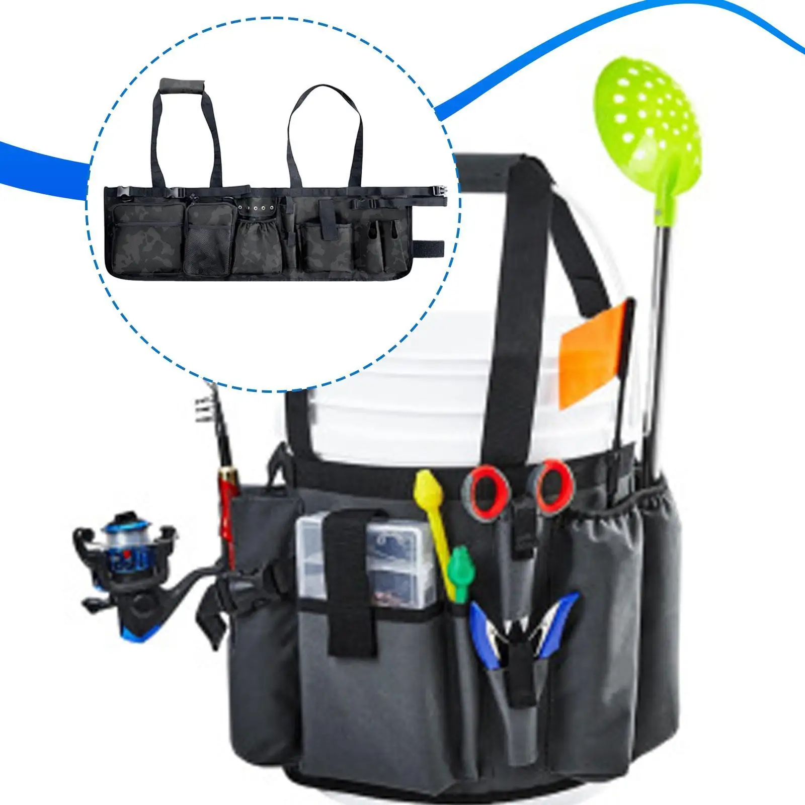 Imagine effortlessly organizing all your fishing essentials with this versatile, high-quality fishing bucket organizer. Crafted from tough Oxford cloth, it resists wear and tear, ensuring longevity during rugged outdoor adventures. Its broad, rectangular design fits securely over most 5 to 6-gallon buckets, providing quick access to tools and gear. With multiple storage compartments, including a main zippered pocket, a secure pouch, external mesh for bait, and tool pouches, you'll keep everything neat and within reach. Six hanging holes for lures, two rod holders, and a plier holder offer convenience for quick access. The adjustable strap and buckle ensure a snug fit, making setup and transport effortless. Enjoy a clutter-free fishing experience with this reliable organizer ready to meet your outdoor needs.