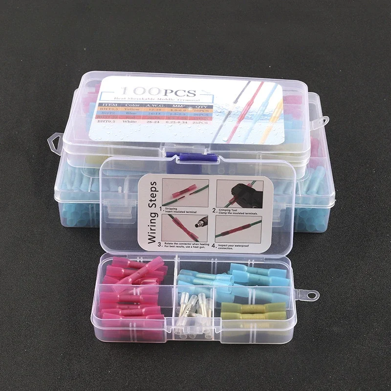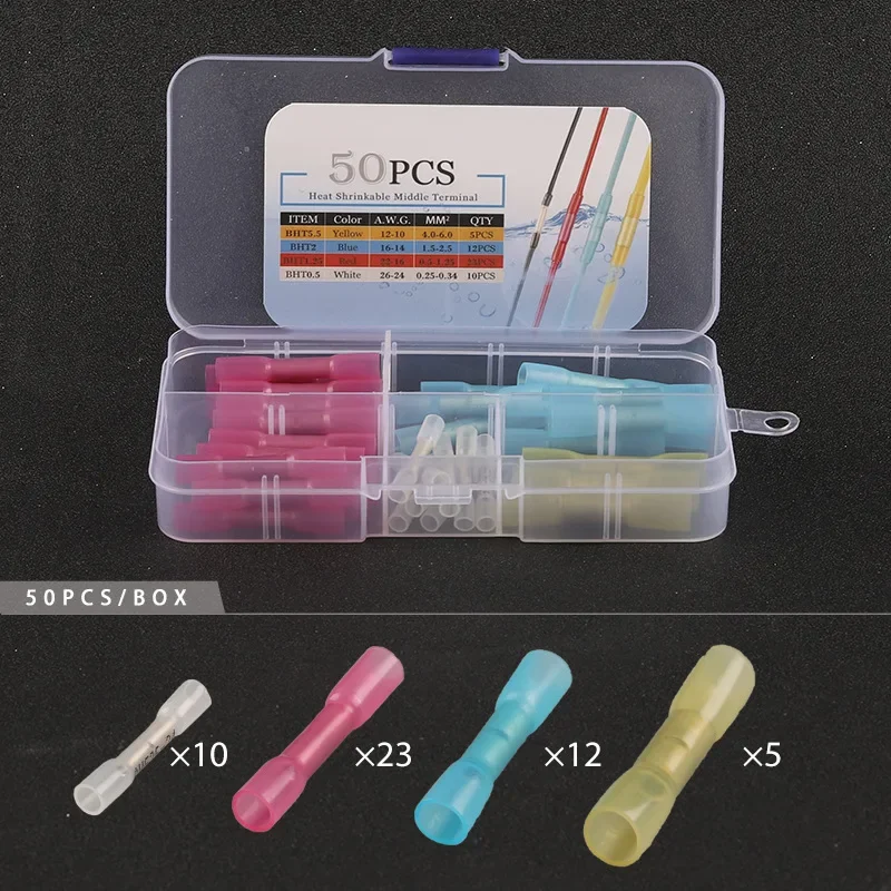 Upgrade your electrical projects with this comprehensive heat shrink butt crimp terminals kit, featuring waterproof solder seal sleeves with a 3:1 shrinkage ratio, a minimum shrink temperature of 175°F (80°C), and a full recovery temperature of 265°F (130°C). Operating temperature ranges from -65°F to 255°F (-55°C to 125°C). Choose between a 50-piece set weighing 71g, measuring 13cm x 7cm x 2.4cm, or a 100-piece set weighing 164g, measuring 17cm x 10cm x 2.5cm. Both kits include color-coded connectors in white (0.5mm), red (1.25mm), blue (2mm), and yellow (5.5mm), ensuring reliable, safe connections for automotive, marine, and electrical wiring projects.