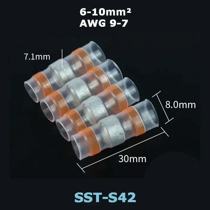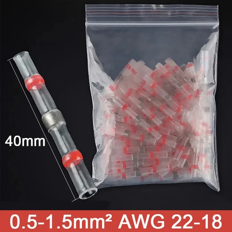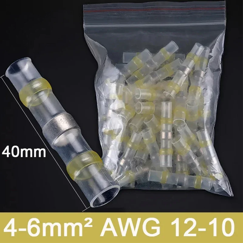 Experience secure and waterproof electrical connections with these heat shrink solder seal wire butt connectors, compatible with wire gauges 0.25-10mm² (AWG 26-7). Featuring transparent, flexible plastic casings with vivid color coding—blue, orange, green, yellow, red, white, and purple—these connectors provide a sleek, modern aesthetic while ensuring durable insulation. Designed for easy installation, they operate reliably between -55°C to 125°C, with a shrinkable temperature exceeding 160°C, and boast an IP67 waterproof rating. Available in packs of 5, 10, 20, or 30 pieces, they are ideal for creating robust, waterproof wire splices in various electrical and industrial applications.